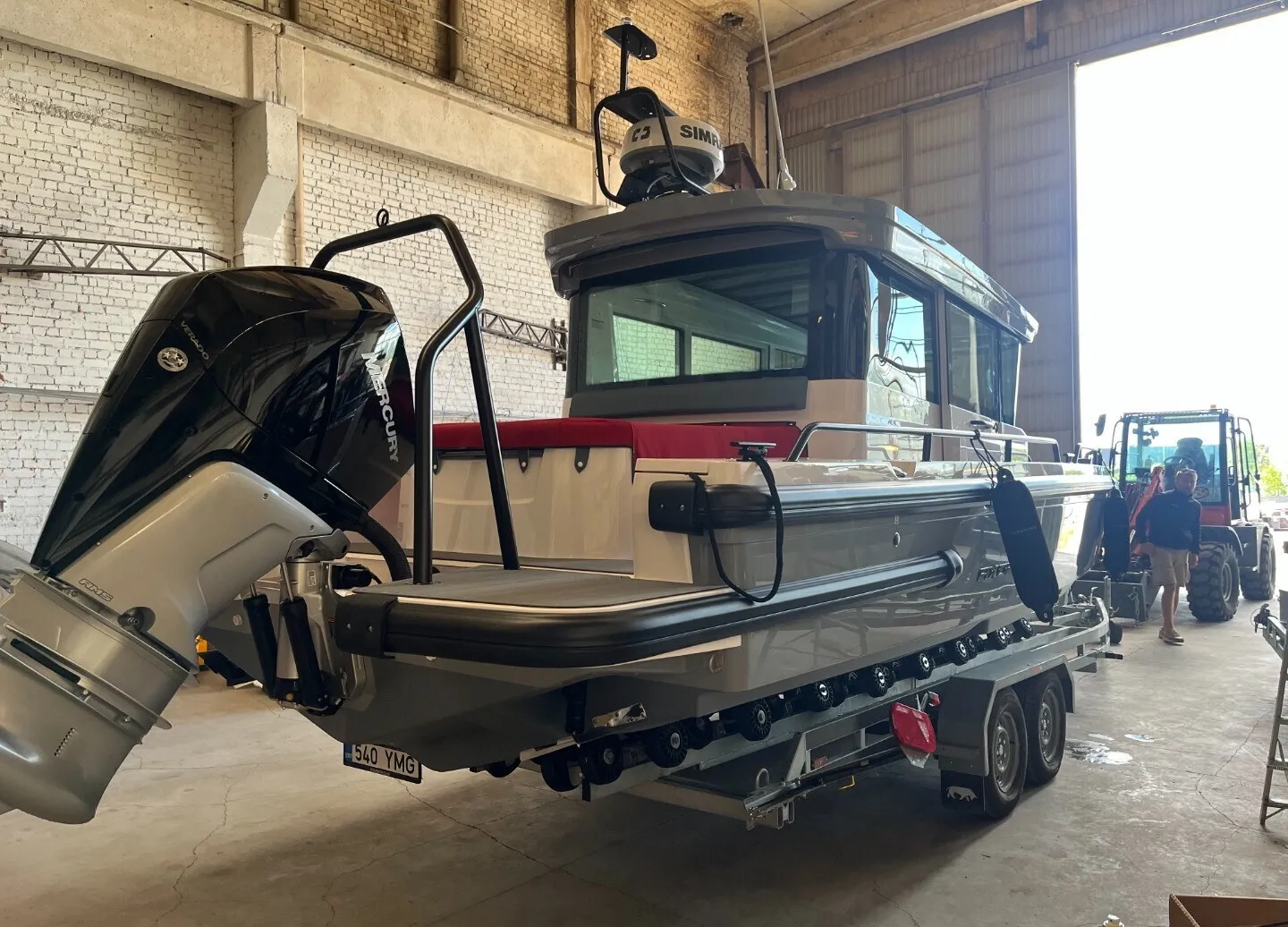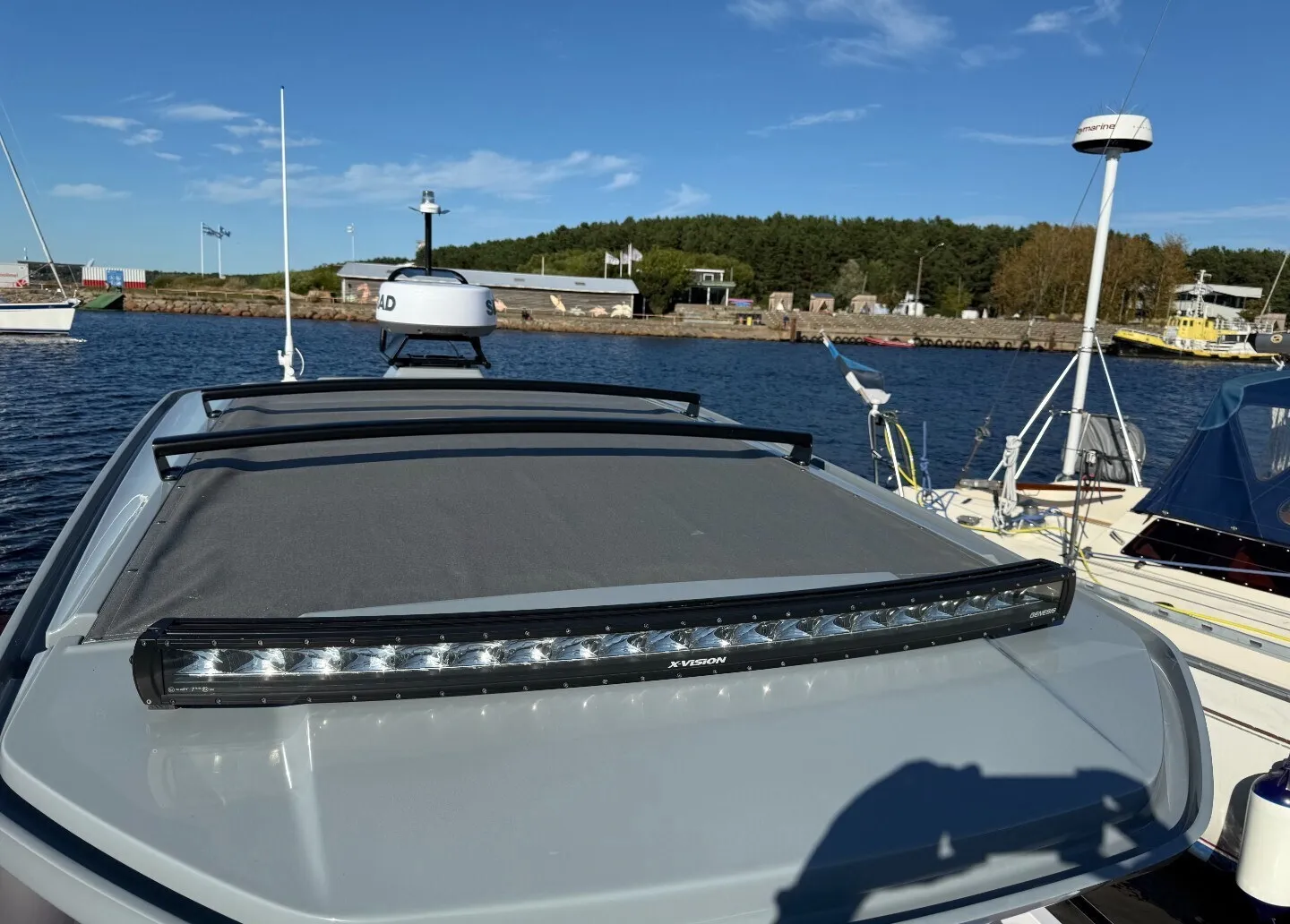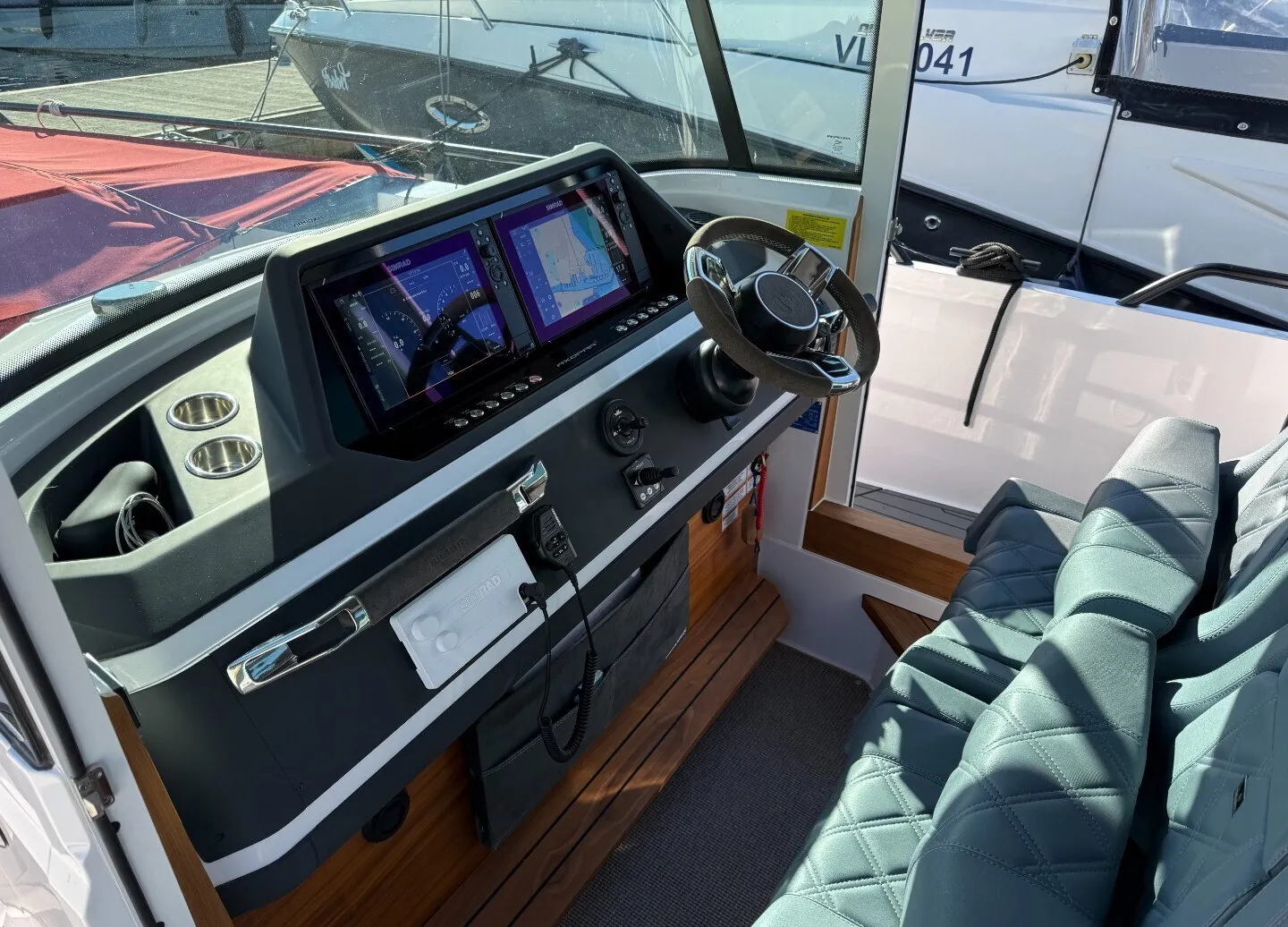 Utrustning: Mercury Verado V8 300, svart, propeller Enertia Eco 19”, BRABUS Line färguppgradering – grå, akterkabin, toalettpaket, elektrisk färskvattenspolning, 40 l septiktank, belysningspaket, premiumpaket, silvertex klädsel, Interiör – Silvertex Storm, bottenfärg, bogpropeller Side-Power, värmare Webasto, landström 230 V, trimplan med joystick, färskvattensystem, dusch på akterdäck, dynor för akterdäck – silvertex, rött hamnkapell – akterdäck, vattenskidbåge, elektriskt soltak Webasto, toppmatad kyl, Simrad Radar Halo20+, plotter/GPS Twin Simrad GO12, ekolod, Simrad VHF, Fusion ljudsystem, ljuduppgradering 1, ljuduppgradering 2, ljusramp.