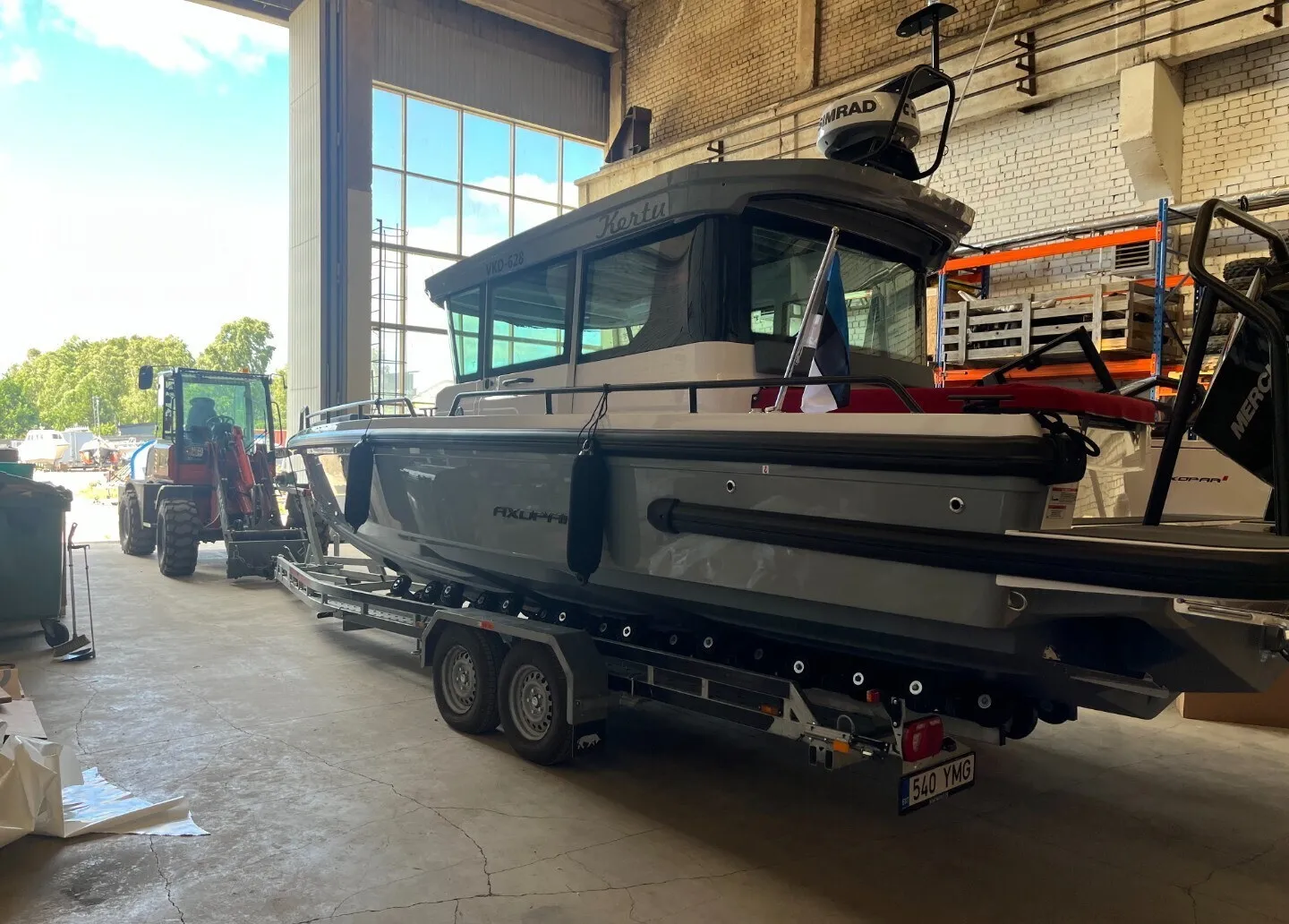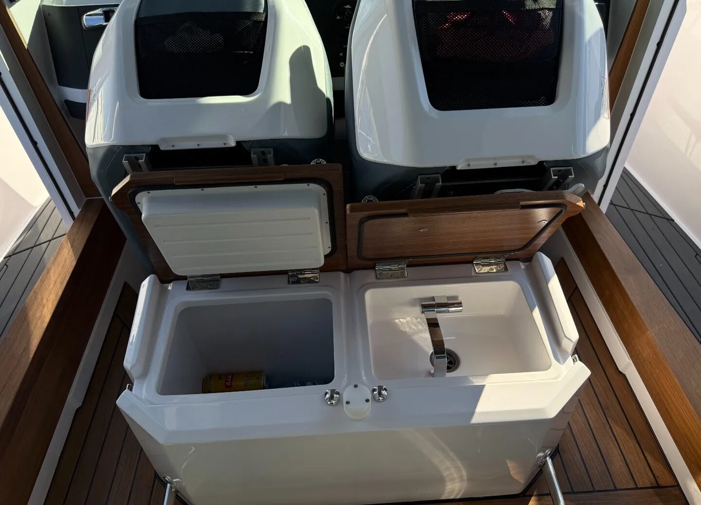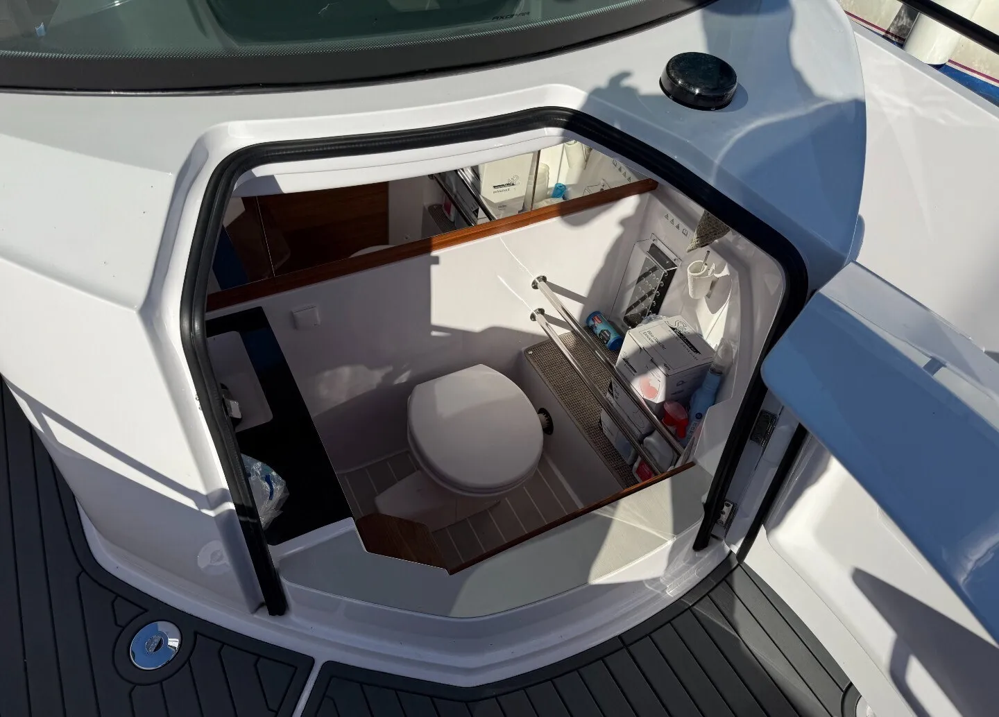 Utrustning: Mercury Verado V8 300, svart, propeller Enertia Eco 19”, BRABUS Line färguppgradering – grå, akterkabin, toalettpaket, elektrisk färskvattenspolning, 40 l septiktank, belysningspaket, premiumpaket, silvertex klädsel, Interiör – Silvertex Storm, bottenfärg, bogpropeller Side-Power, värmare Webasto, landström 230 V, trimplan med joystick, färskvattensystem, dusch på akterdäck, dynor för akterdäck – silvertex, rött hamnkapell – akterdäck, vattenskidbåge, elektriskt soltak Webasto, toppmatad kyl, Simrad Radar Halo20+, plotter/GPS Twin Simrad GO12, ekolod, Simrad VHF, Fusion ljudsystem, ljuduppgradering 1, ljuduppgradering 2, ljusramp.