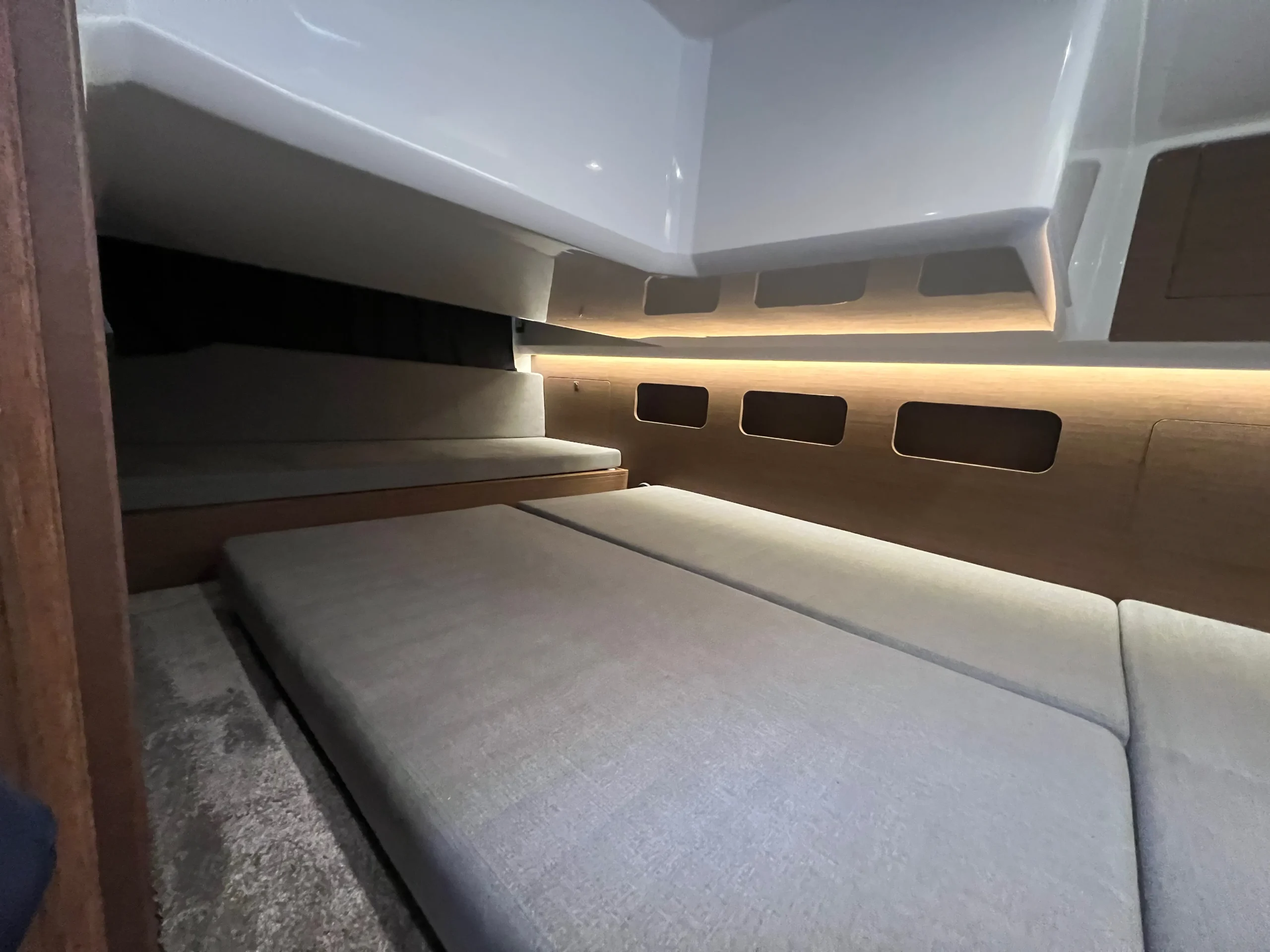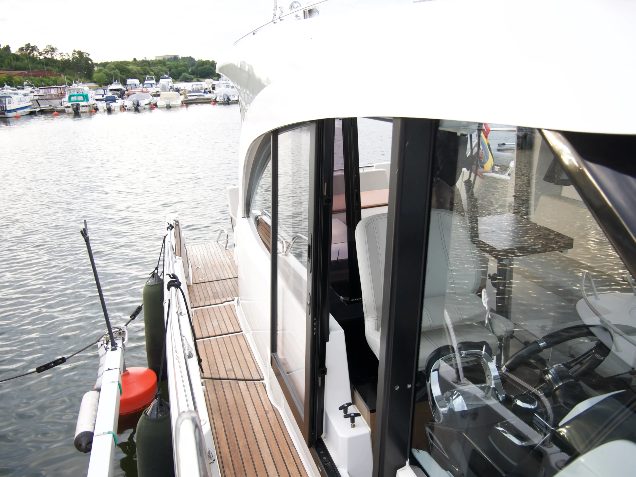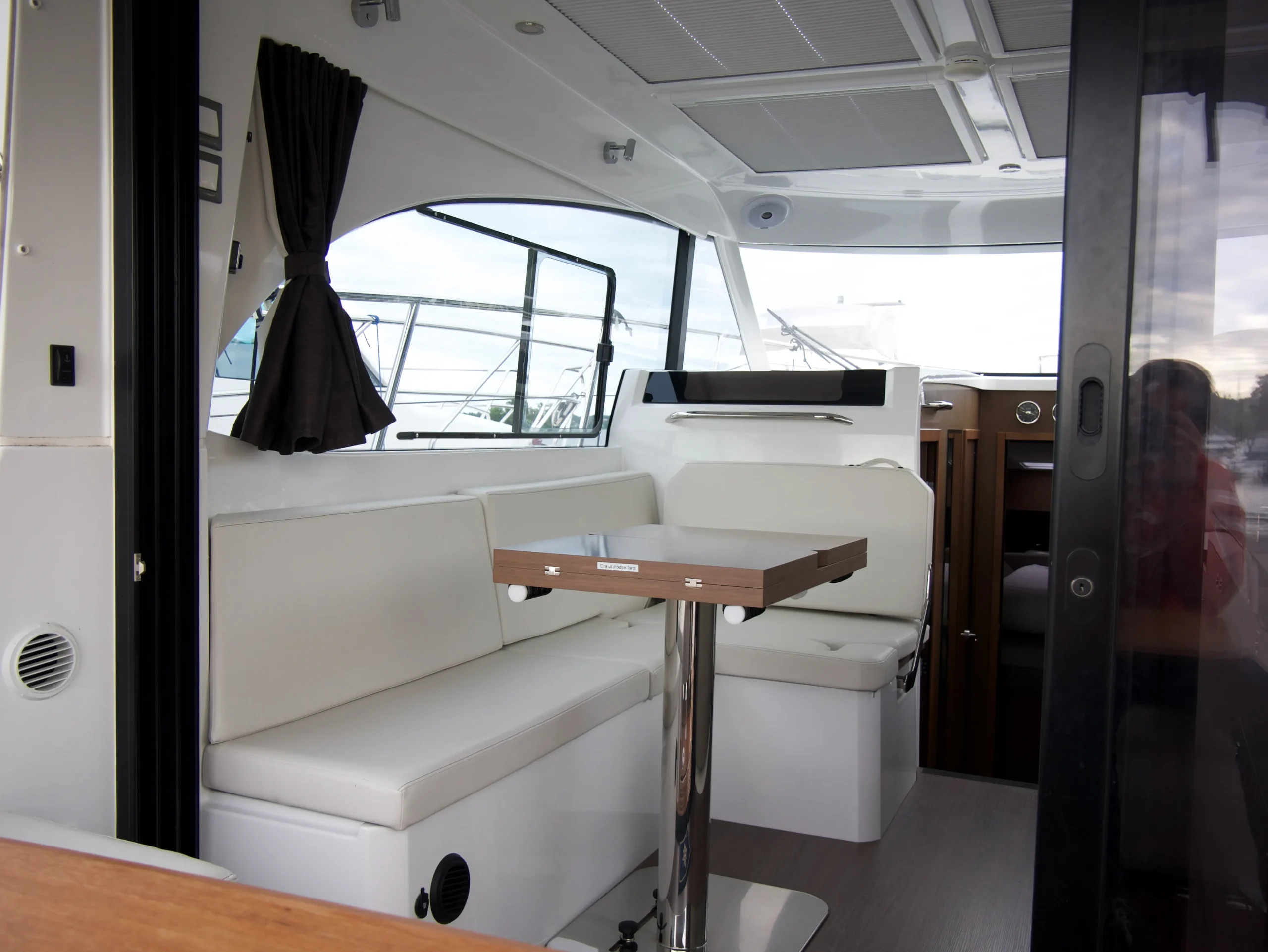 I salongen hittar du en rymlig sittgrupp med matbord samt ett fullt utrustat pentry med allt du behöver för att laga mat ombord. Förarplatsen är ergonomiskt utformad och ger god överblick med all nödvändig utrustning lättillgänglig. Direkt till höger om förarplatsen finns en praktisk sidodörr som ger snabb access till däck. I fören väntar en inbjudande solbädd, och i aktern finner du ett generöst socialt utrymme som enkelt kan omvandlas till ytterligare en solplats. Båten är utrustad med två separata kabiner och erbjuder totalt upp till fem sovplatser. Det finns även ett separat våtutrymme med både dusch och toalett.