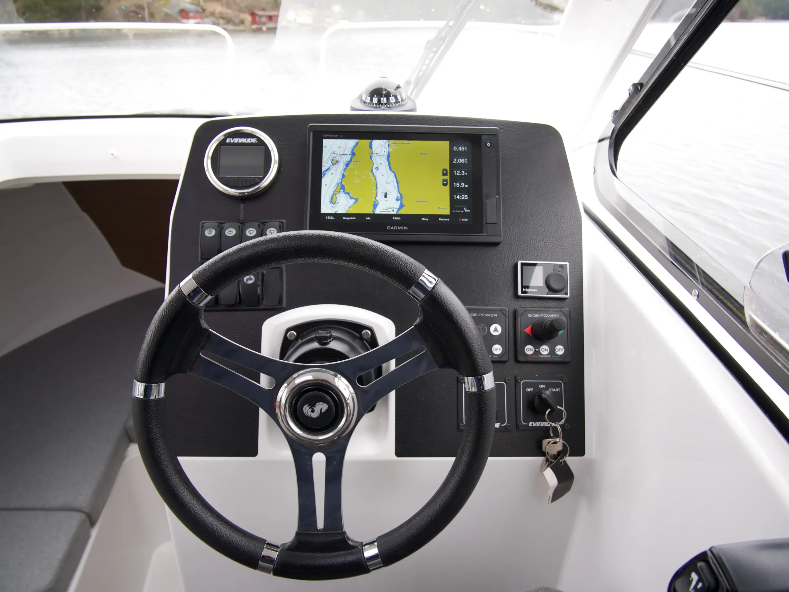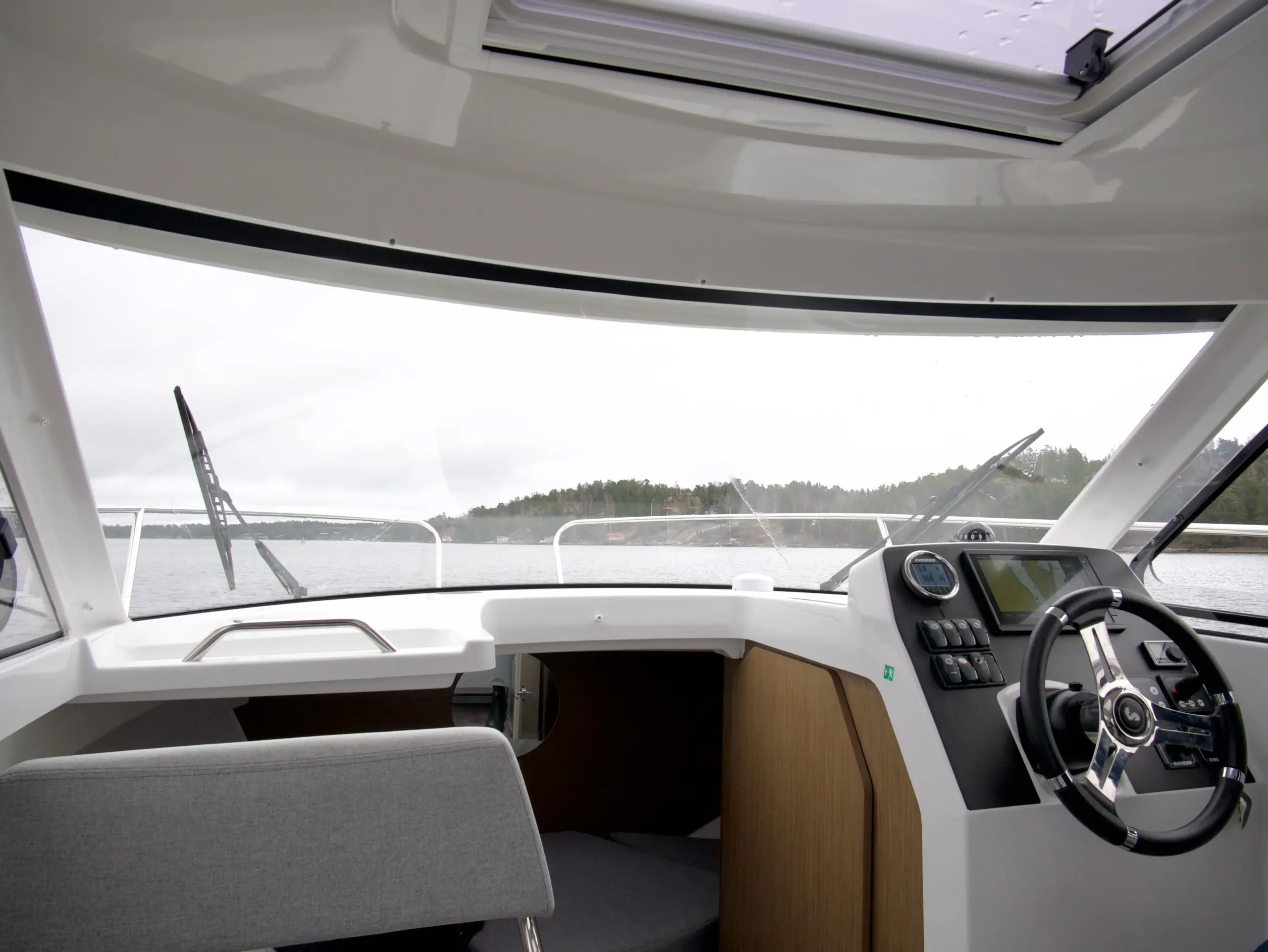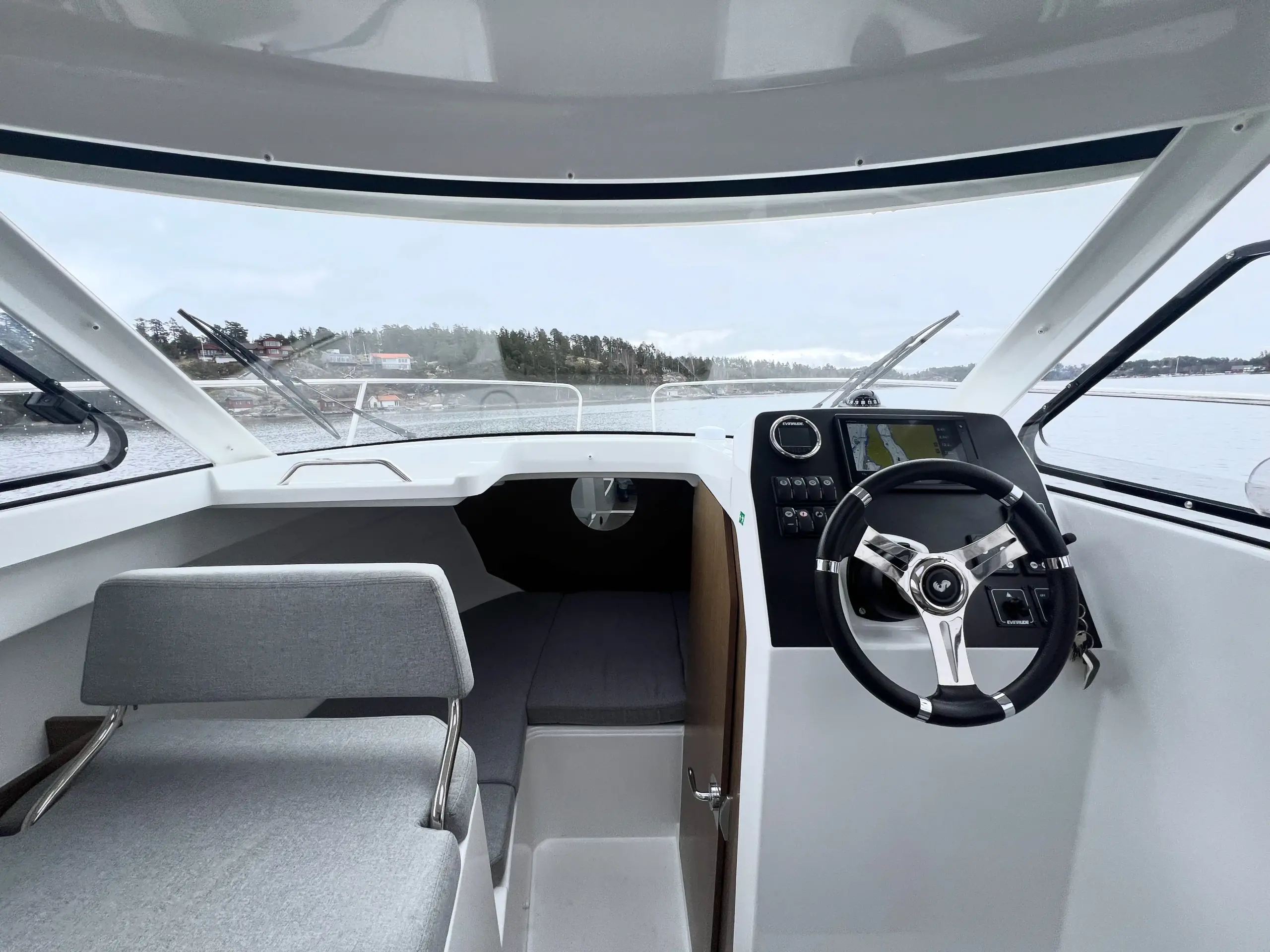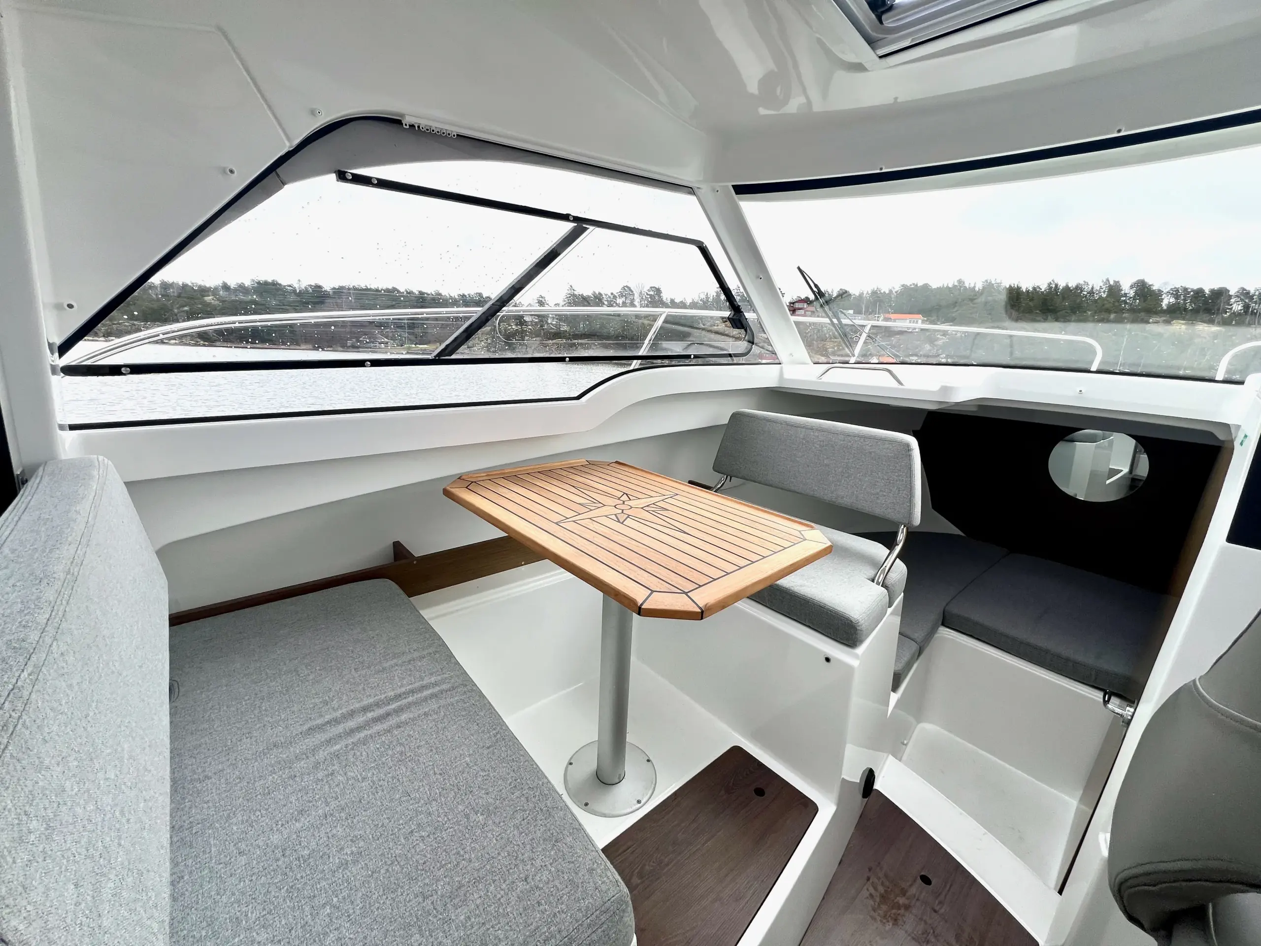 Som förare har du en bra överblick på vattnet framför dig och nära till hands har du utrustning som bogpropeller, navigation från Garmin och kontroll till ankarspelet. Bredvid förarplatsen sitter passagerare bekvämt i en soffgrupp med bord som även går att göra till en bädd, blir det varmt en sommardag kan man med fördel öppna upp båtens sidofönster och taklucka.