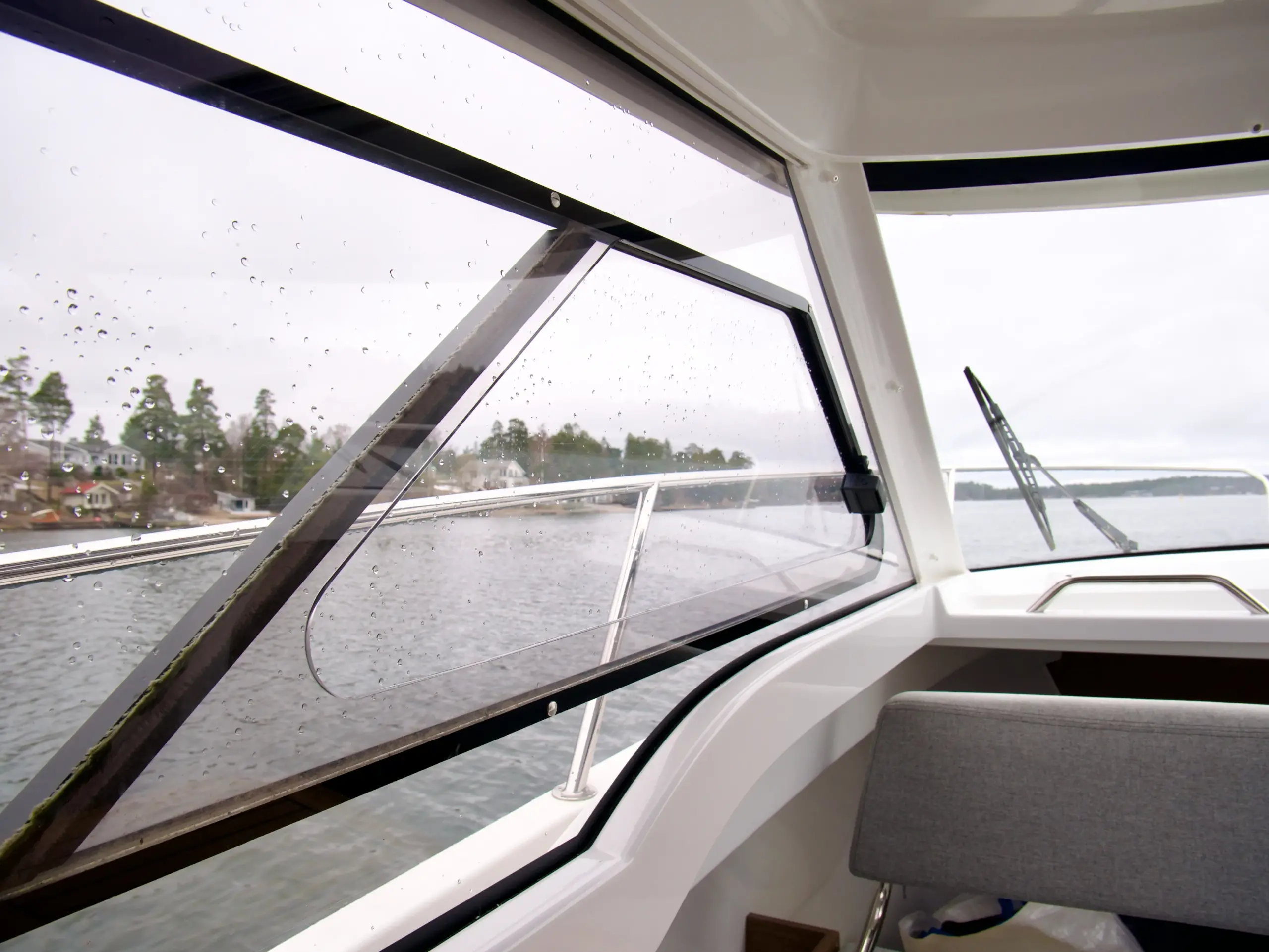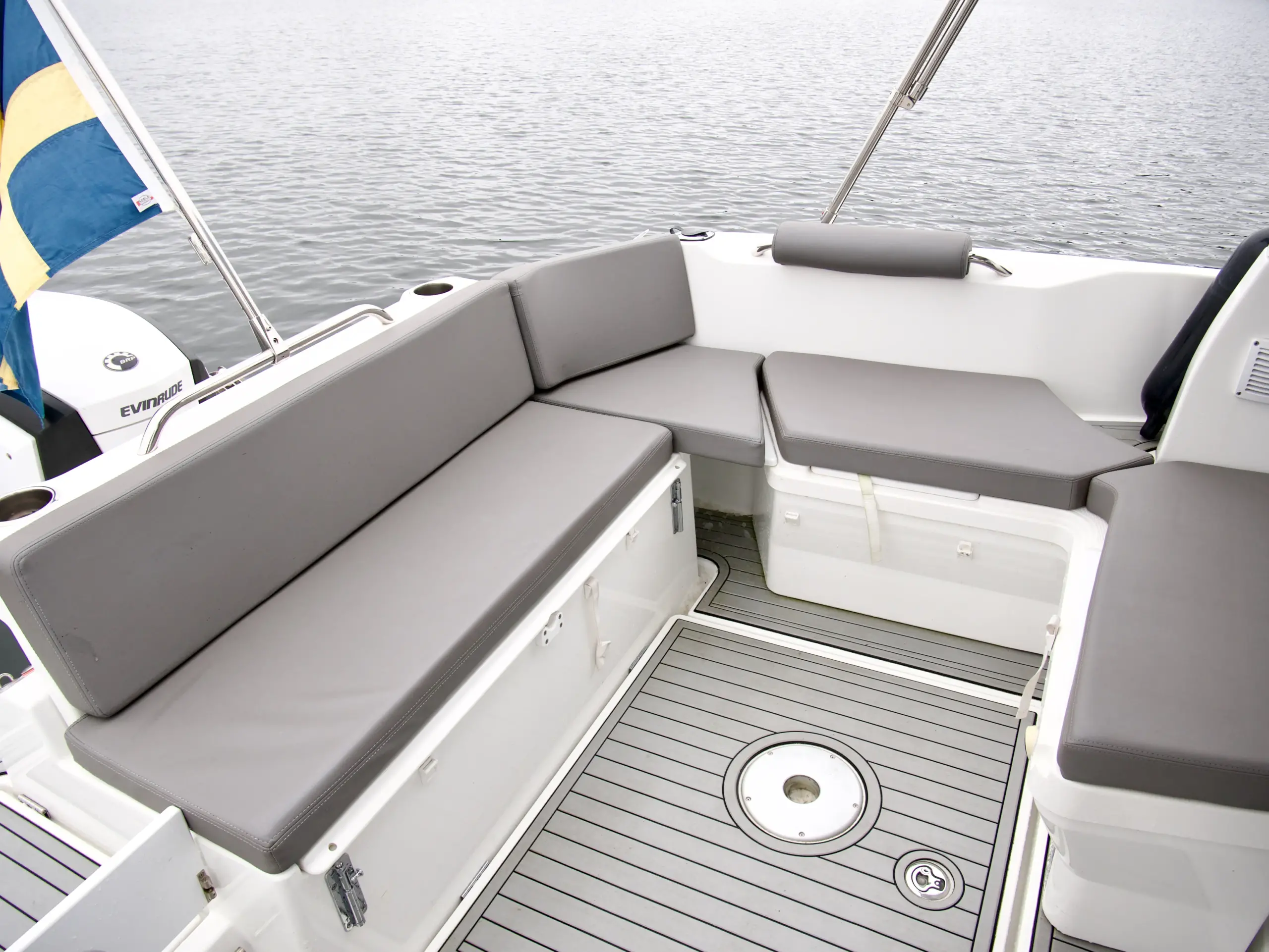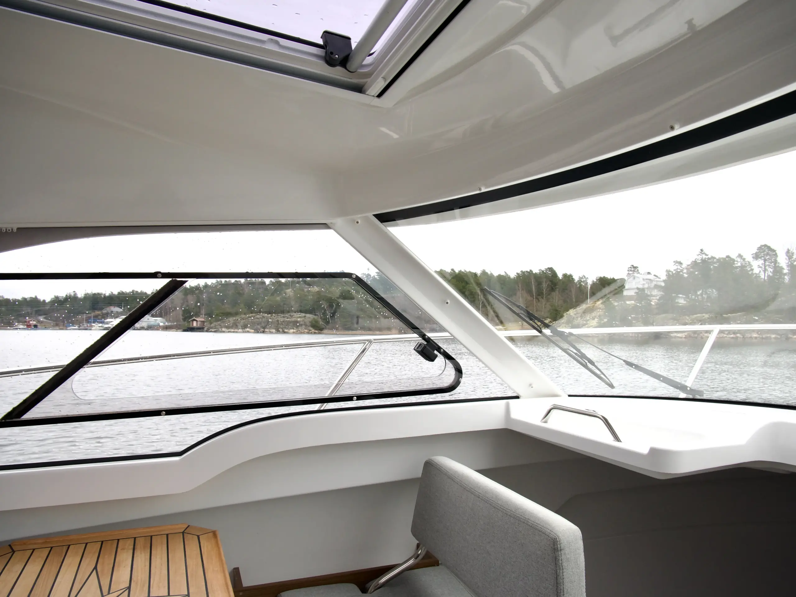 Som förare har du en bra överblick på vattnet framför dig och nära till hands har du utrustning som bogpropeller, navigation från Garmin och kontroll till ankarspelet. Bredvid förarplatsen sitter passagerare bekvämt i en soffgrupp med bord som även går att göra till en bädd, blir det varmt en sommardag kan man med fördel öppna upp båtens sidofönster och taklucka.