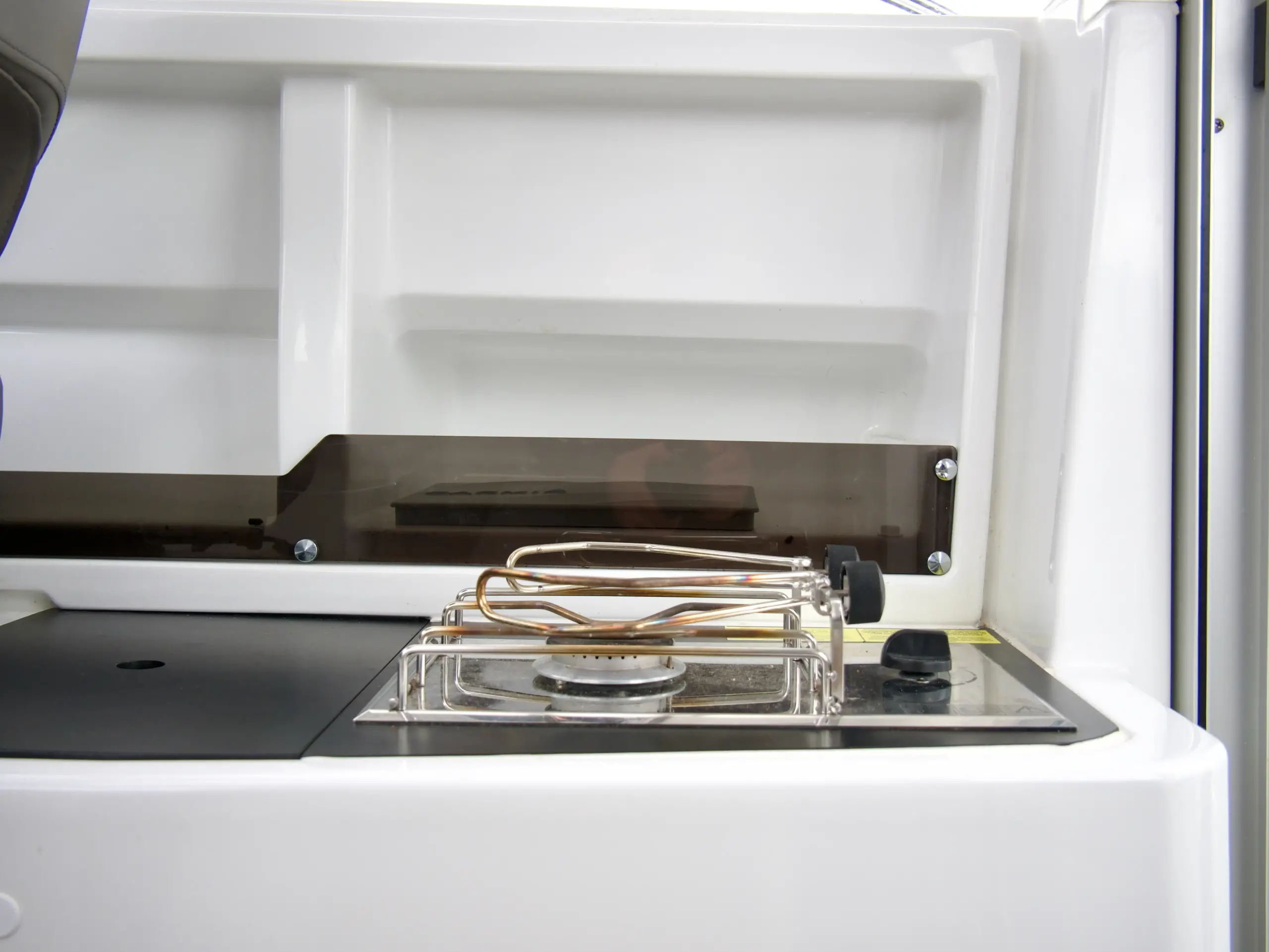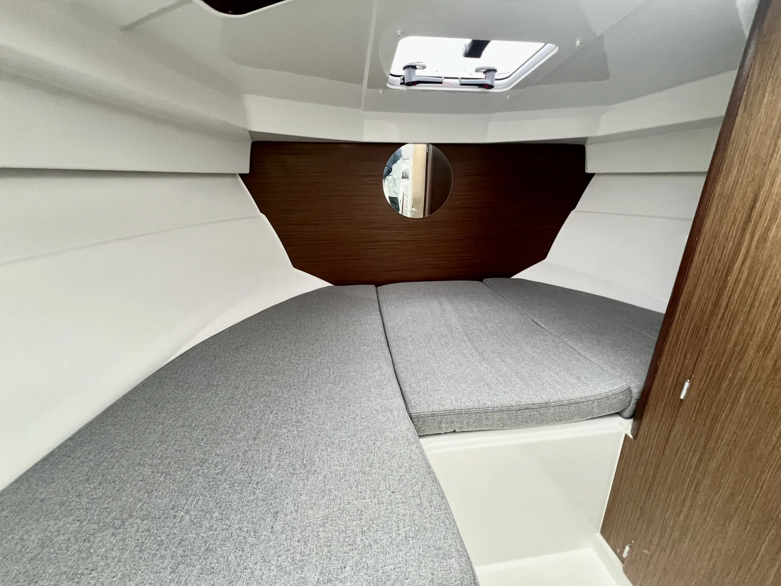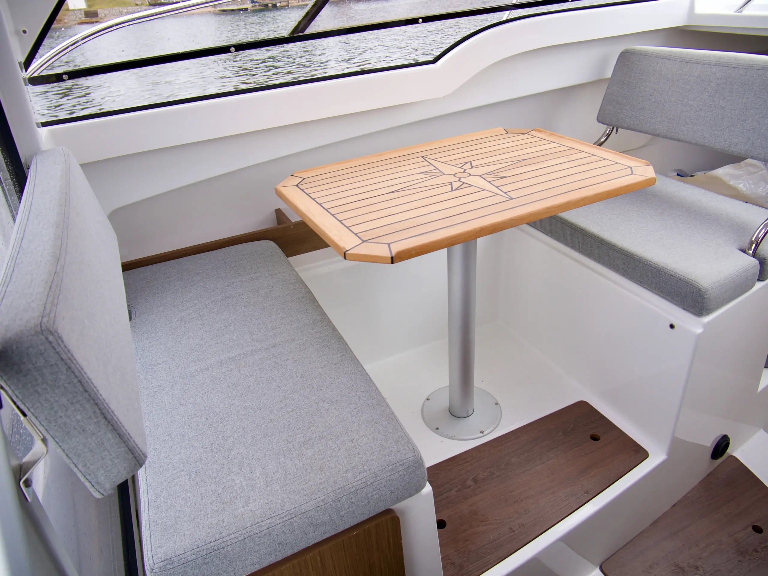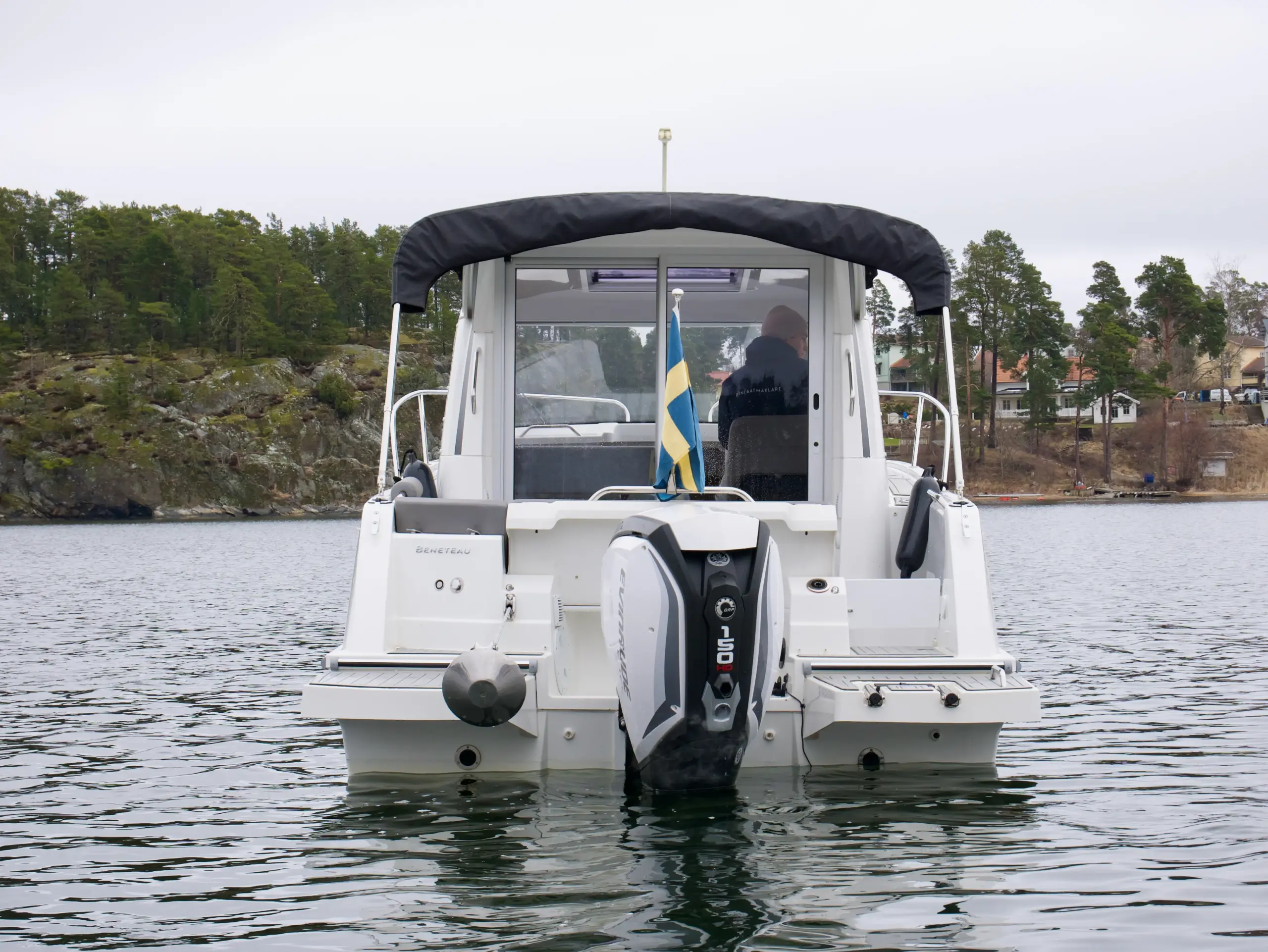 Som förare har du en bra överblick på vattnet framför dig och nära till hands har du utrustning som bogpropeller, navigation från Garmin och kontroll till ankarspelet. Bredvid förarplatsen sitter passagerare bekvämt i en soffgrupp med bord som även går att göra till en bädd, blir det varmt en sommardag kan man med fördel öppna upp båtens sidofönster och taklucka.