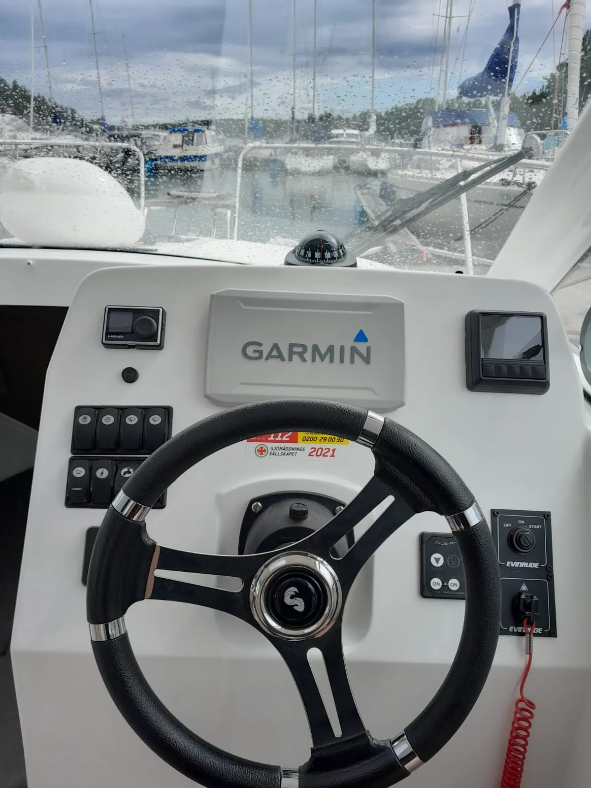 Motorn är en Evinrude 200 HK från 2020 som har gått cirka 150 timmar. Fem års service skedde 2023 vilket innebär att nästa service ska ske 2028 om man följer Evinrudes rekommendationer.