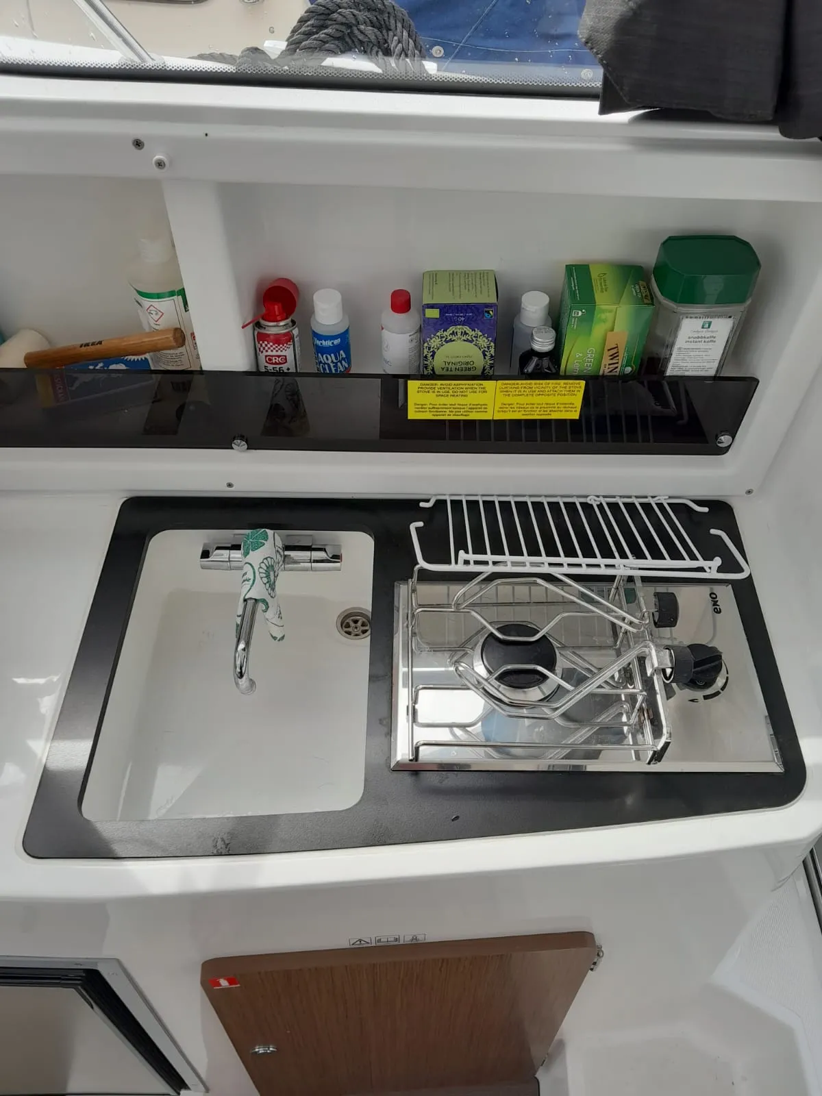 Ombord möts du av en inbjudande kabin med längsgående kök, separat WC och en bädd med sovplatser för två i förpiken. Det finns även en soffgrupp som går att omvandla till ytterligare en bädd.