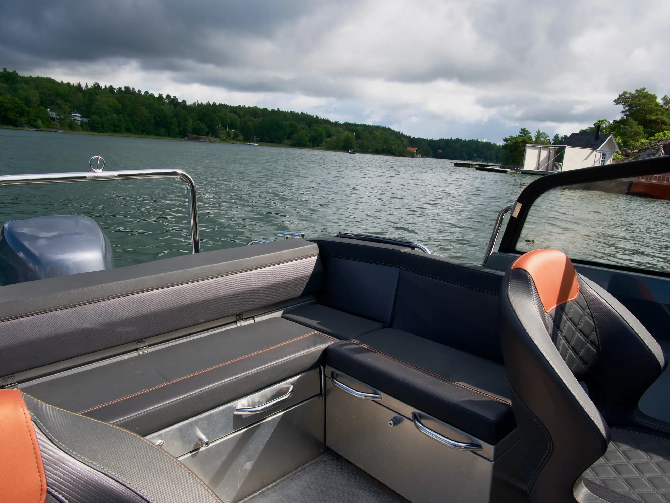Ombord finns två sittplatser på fördäck och generöst med stuvutrymme för packning. I det aktra sällskapsutrymmet sitter man bekvämt skyddad bakom vindrutan med fri sikt åt alla håll. Sittbrunnen har en L-formad soffa med möjlighet till bord, och för den som vill njuta av solen finns en solbädd att fälla upp. Förarplatsen är modernt utformad med ett stilrent gränssnitt – all information om båt och motor visas på en 16″ Buster Q-display med integrerad plotter.