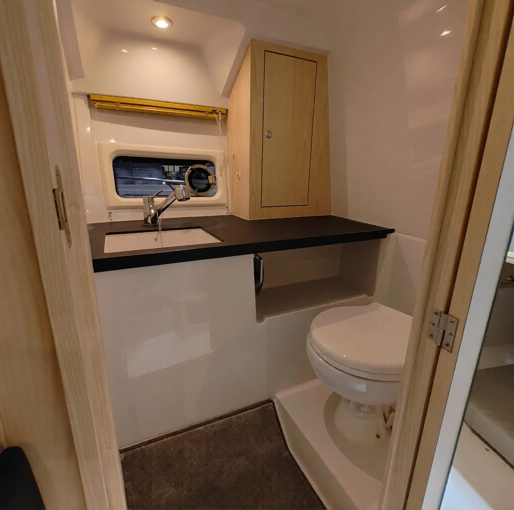 Under däck är det gott om ljus tack vare stora fönster och takluckor. Här erbjuds sovplatser för 4 personer uppdelade på en stickkoj samt en masterbed. Det finns även en separat toalett.