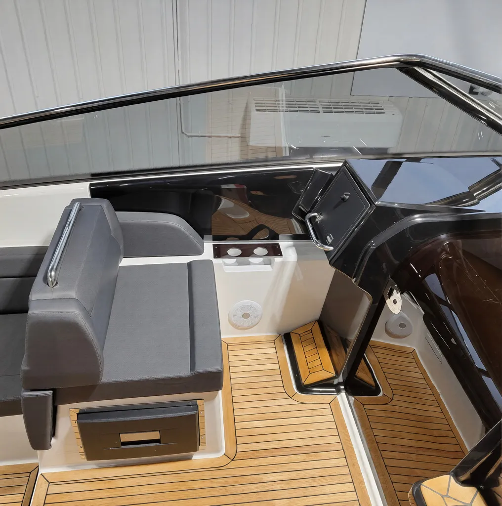 Standardutrustning: 16” kartplotter med ekolodsgivare, elhydraulisk styrning, vindrutetorkare 2 st, teak i cockpit, hamnkapell, förarstolar på skenor, dynsats, mattset i kabin, pentry med diskho, Dometic kylskåp 70 liter, cockpitbord med 4 mugghållare, elektriskt bordsstativ, elektrisk spolning till toalett, persienn i toalett, spegel i dörr, öppningsbar däckslucka, stora takfönster, stora skrovfönster, LED-förlanternor, LED-navigationsljus, 4 x USB-uttag, 3 x 12V-uttag, syrafasta räcken, ankarluckor 3 st, badplattformar med badstege, brandsläckare, automatiska länspumpar 2 st, mugghållare 8 st, handskfack för förare, handskfack för passagerare, knapar 4 st, fällbara knapar 2 st, fendrar 4 st med skydd och linor, fenderkrokar 4 st, flaggstångsfäste, vit skrovfärg