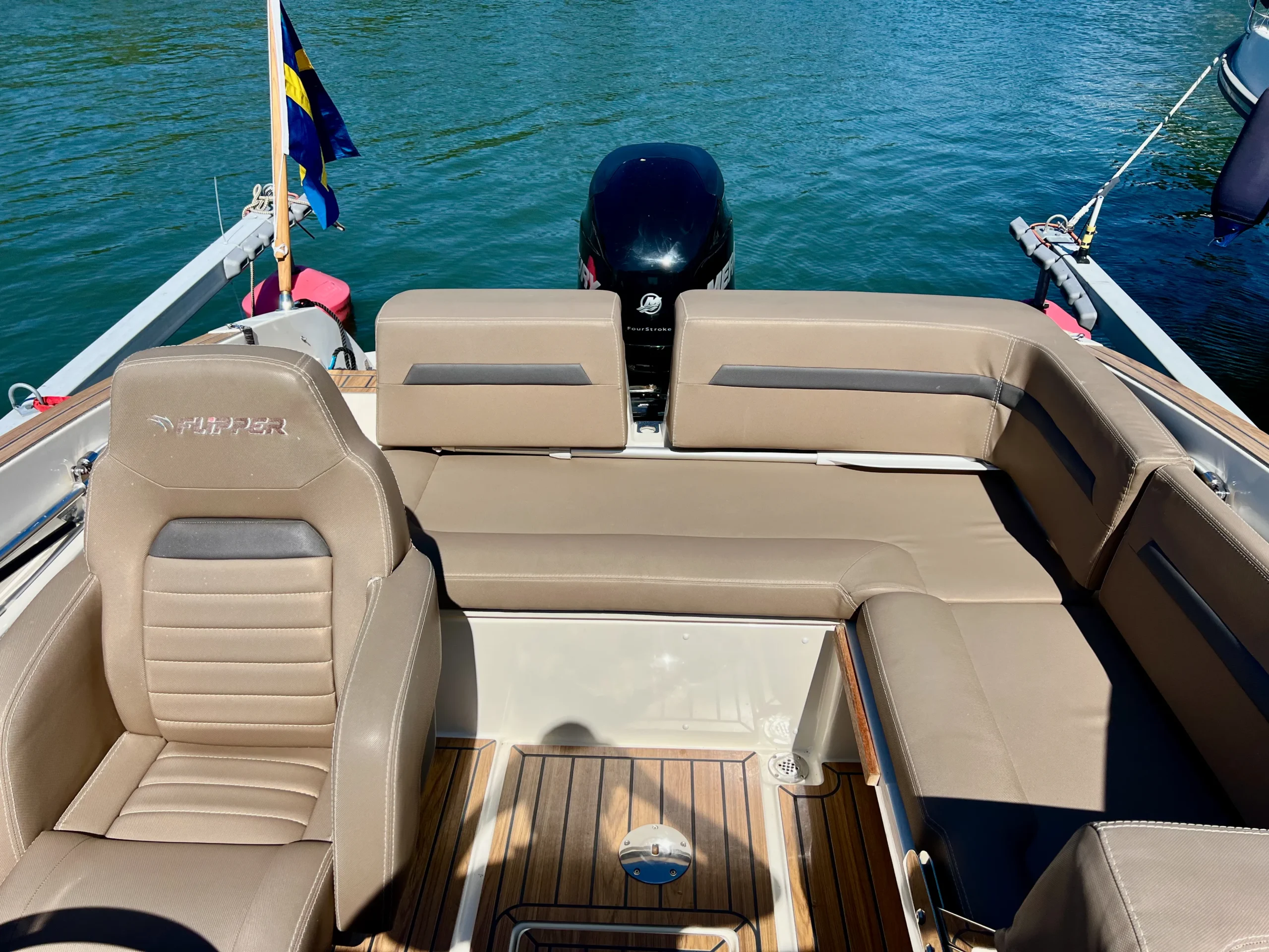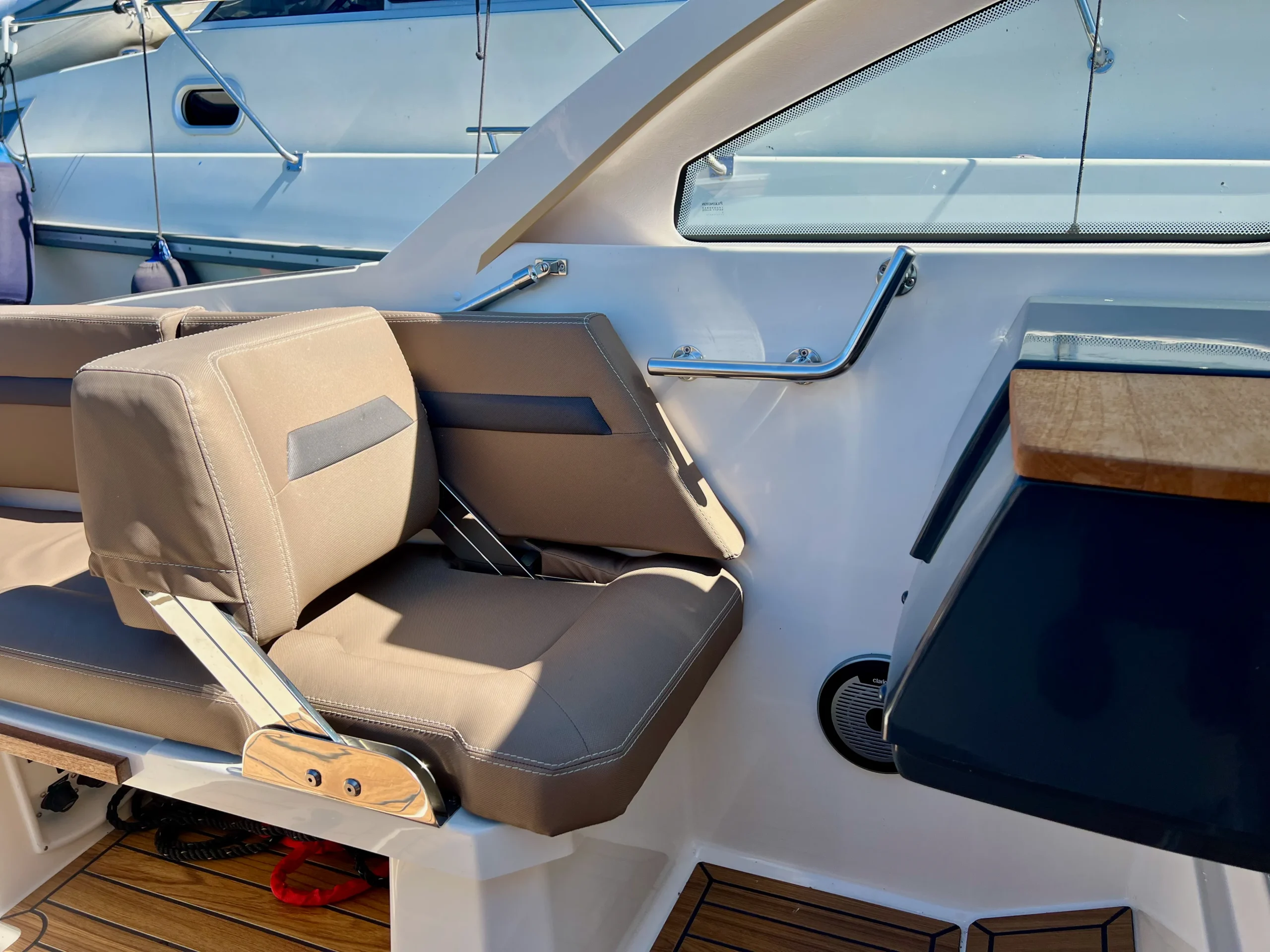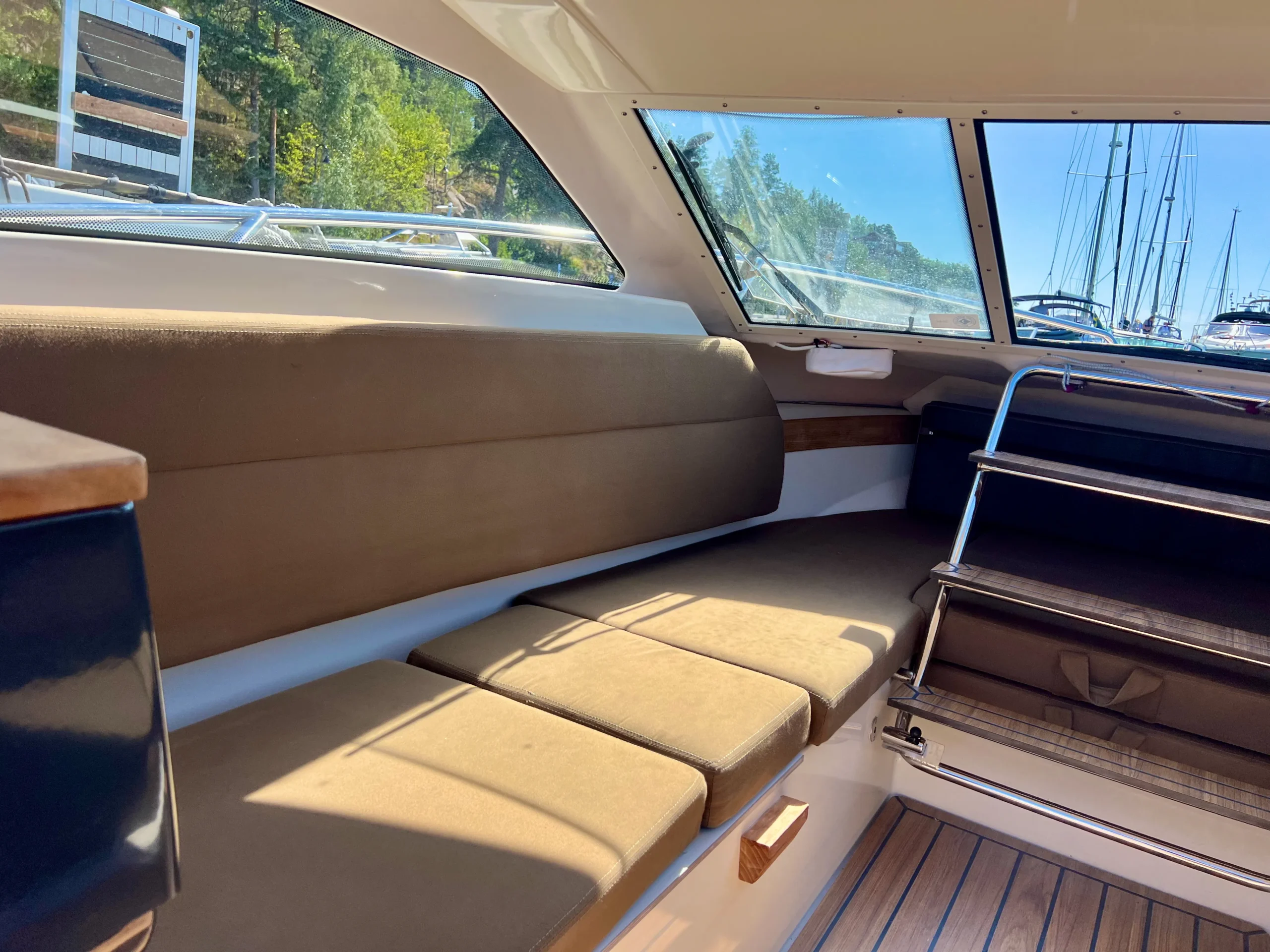 Ombord möts du av en välplanerad sittbrunn. Här finns en bekväm u-soffa med plats för fyra personer, som även går att göra om till en solbädd. Soffan har även ett fällbart ryggstöd för att kunna skapa en extra passagerarplats. Förarplatsen är försedd med en väldimensionerad plotter, automatiska trimplan och all motordata du kan tänkas behöva för att maximera båtens prestanda.