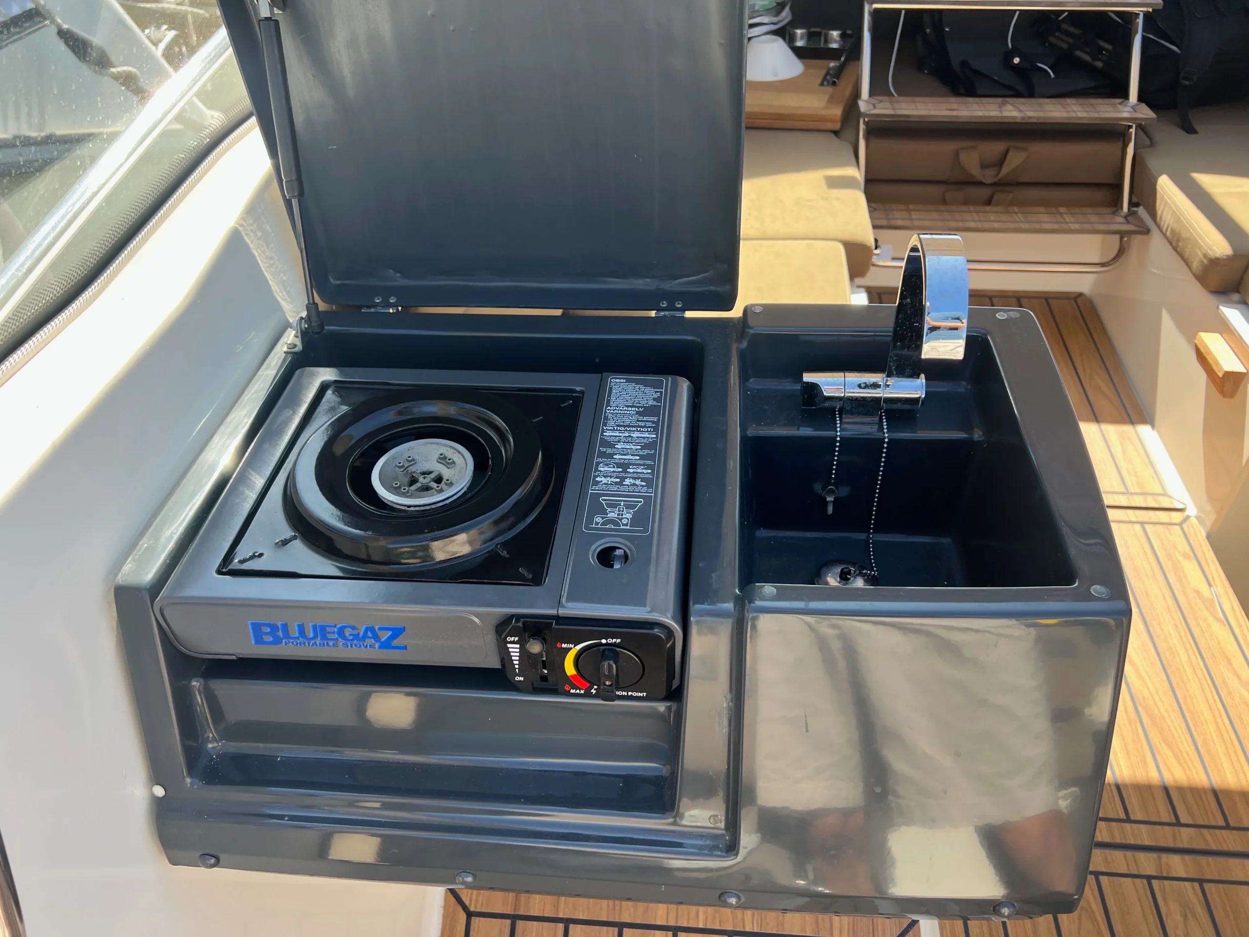 Ombord finns det gott om bekvämligheter, bland annat en kylbox, färskvattensystem, spoltoalett samt en gasolspis.