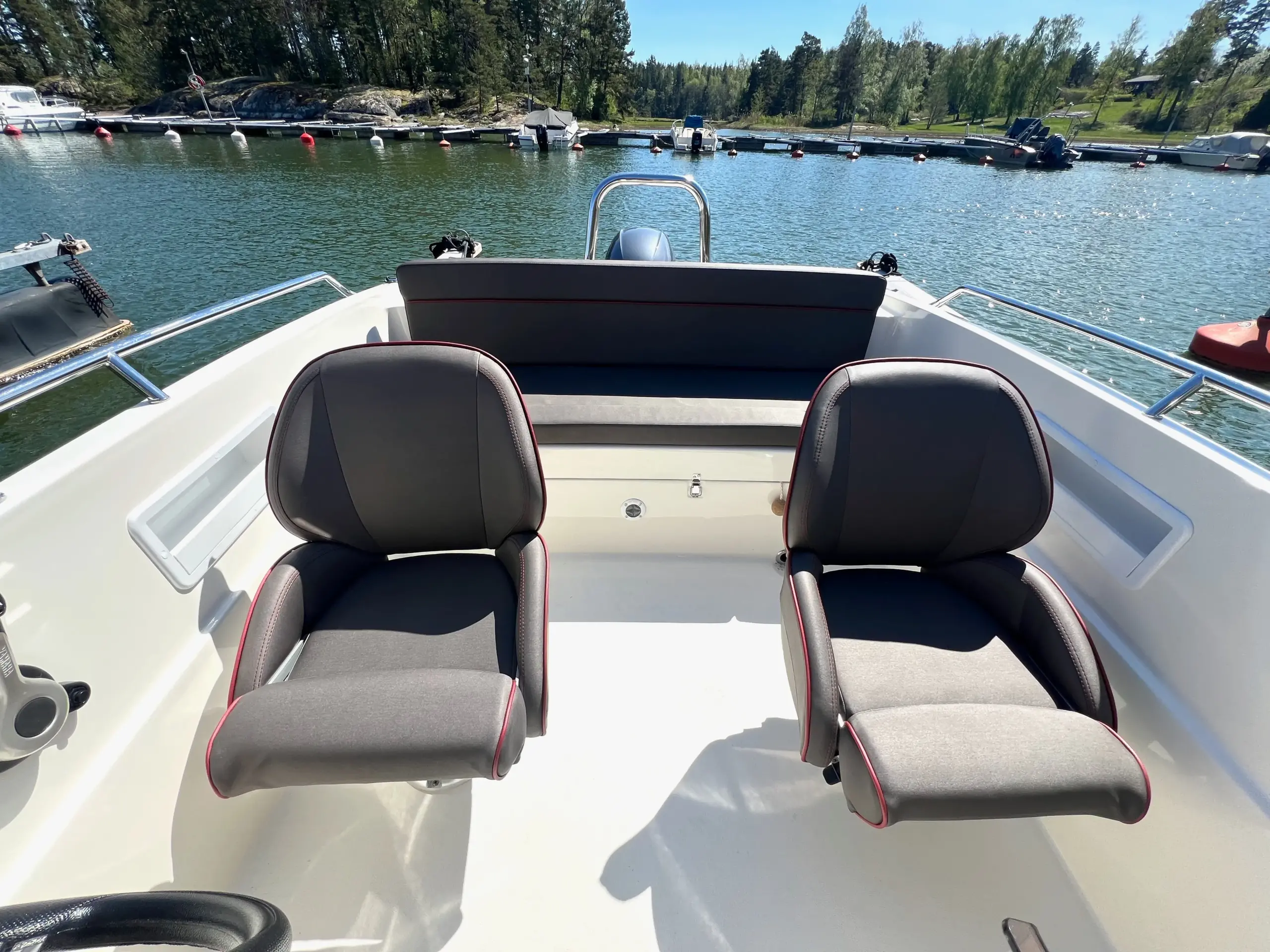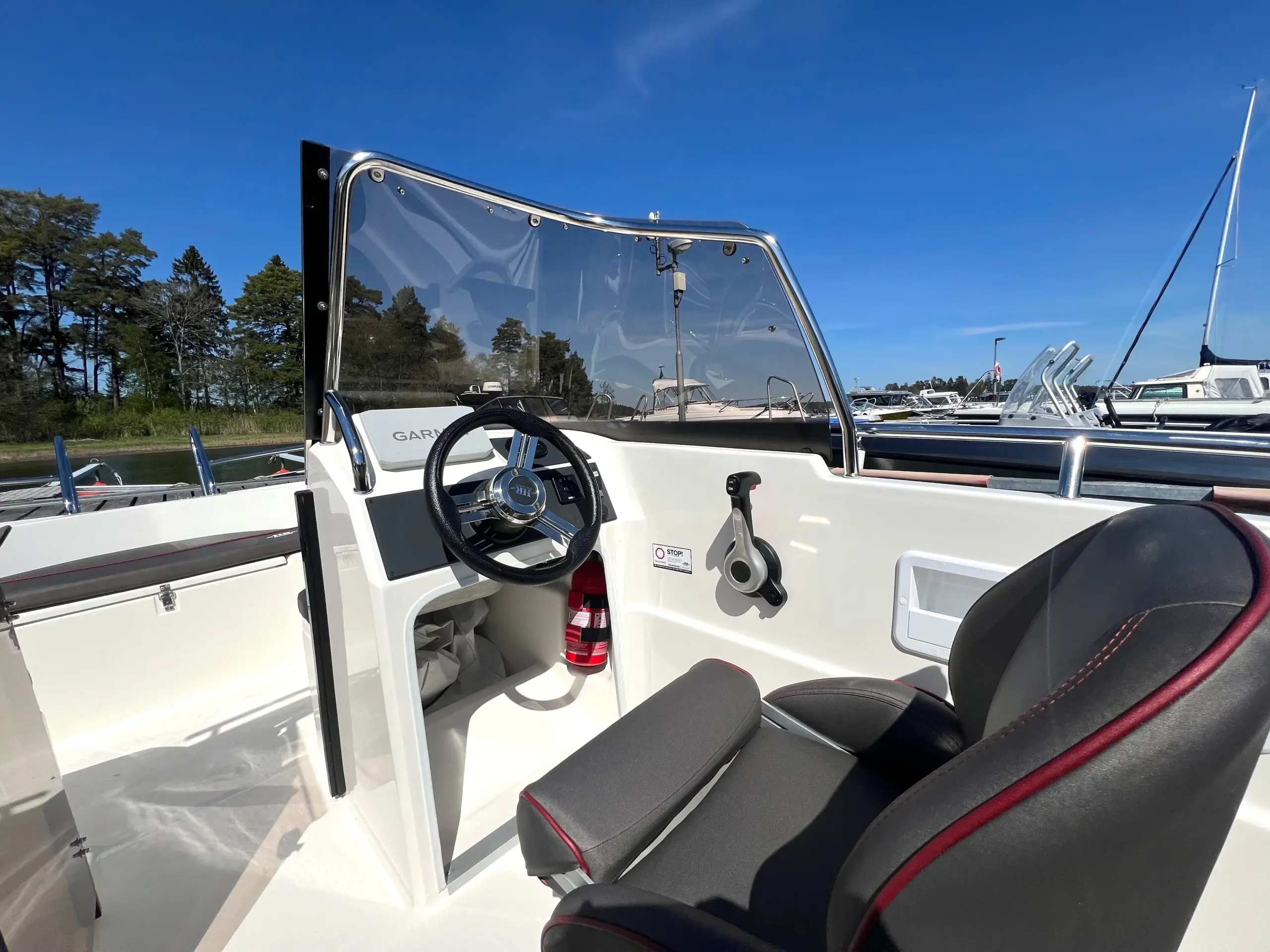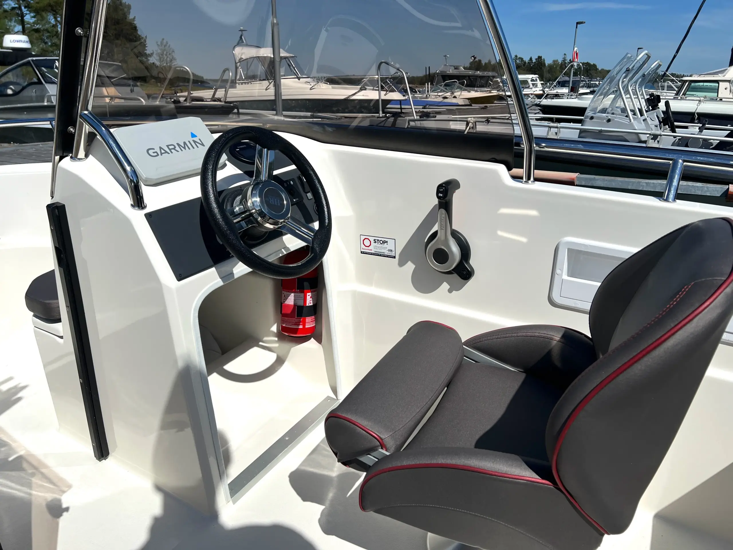 Båten rymmer 5 personer och besättningen sitter skyddat bakom de höga vindrutorna. Det finns även sittplatser med dynsats i fören. Som förare har du en bra överblick runtom båten och nära till hands finns det en 6″ plotter från Garmin för smidig navigering.