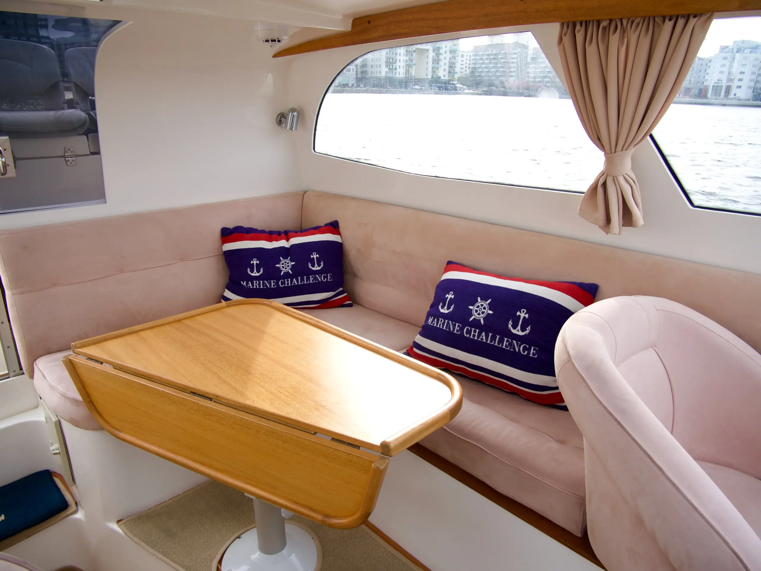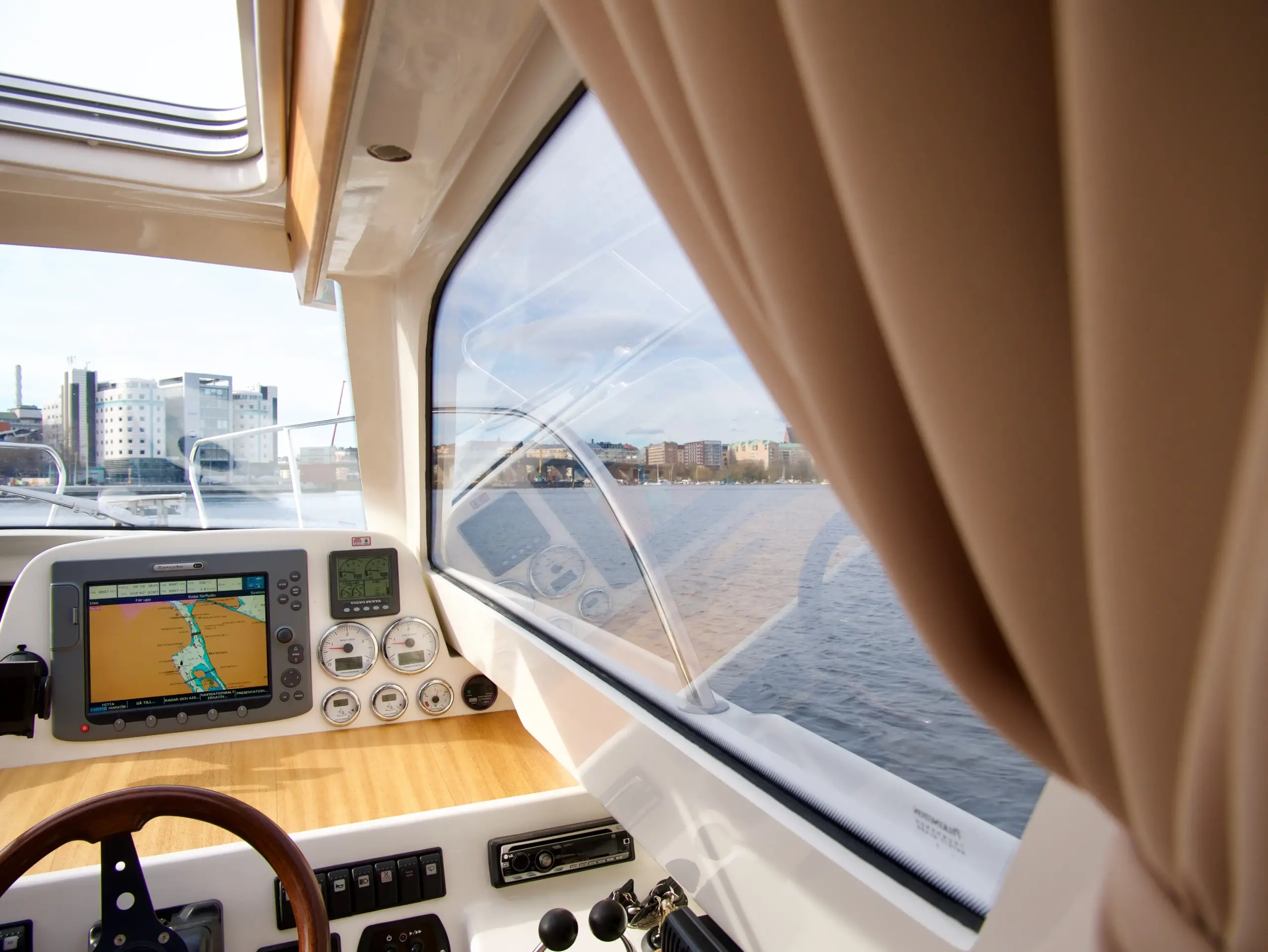 Inne i kabinen möts vi av exklusiva materialval och en väldisponerad planlösning. Här finns det en stor soffgrupp, ett ordentligt pentry med färskvatten, spis och kylskåp samt ytterligare en styrplats. Härifrån har föraren tillgång till en FLIR värmekamera som gör navigering om natten till en barnlek. Fortsätter vi fram i båten nås vi av ytterligare en soffgrupp som går att omvandla till en masterbed med hög komfort. Slutligen finns det även en separat WC ombord.