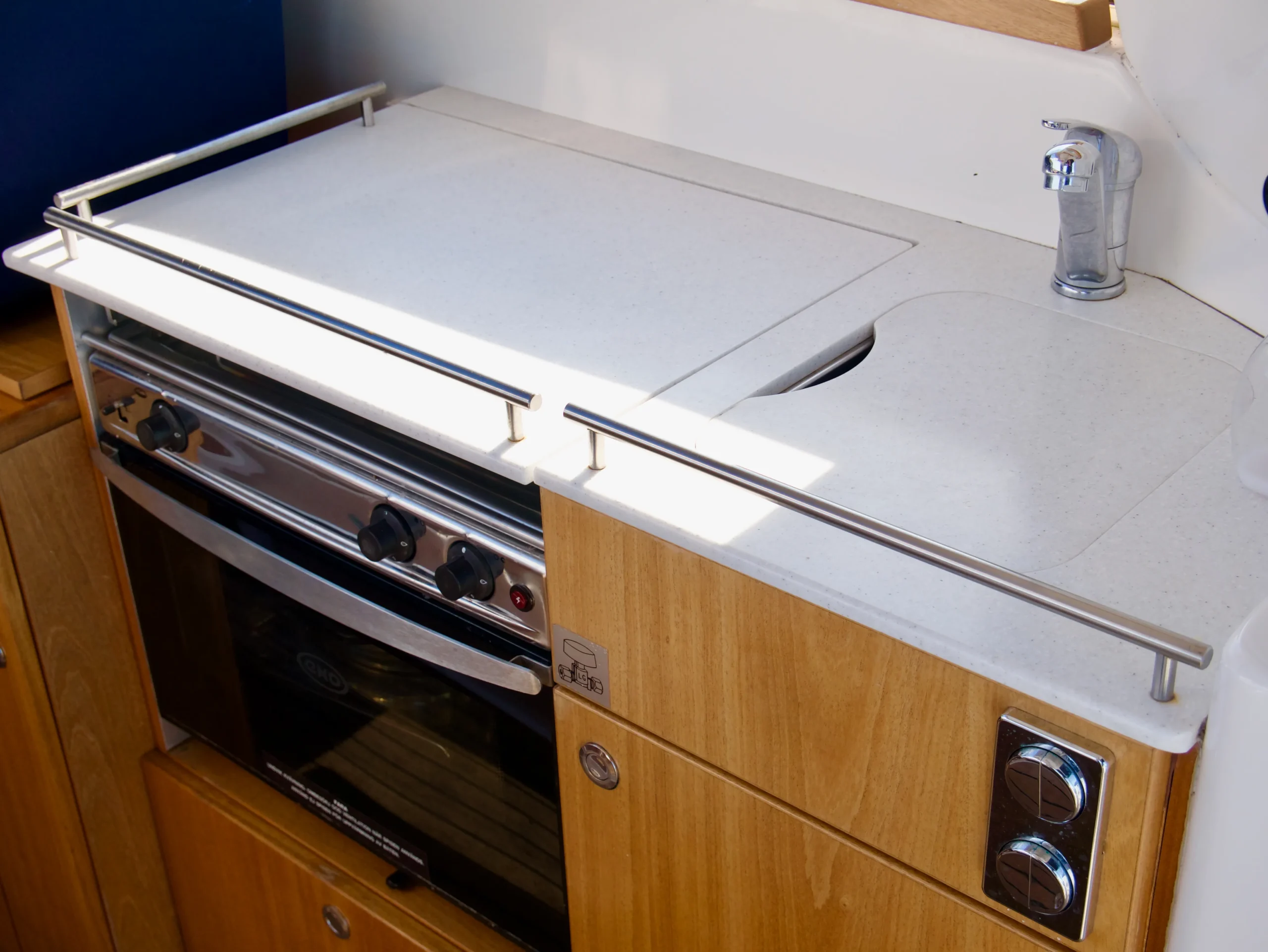 Sittbrunnen består av en u-soffa med bord och ett längsgående kök med gas-spis/ ugn och diskho med färskvatten. Här finns även förarplatsen där man sitter med god överblick över havet med all nödvändig utrustning och motordata nära till hands.