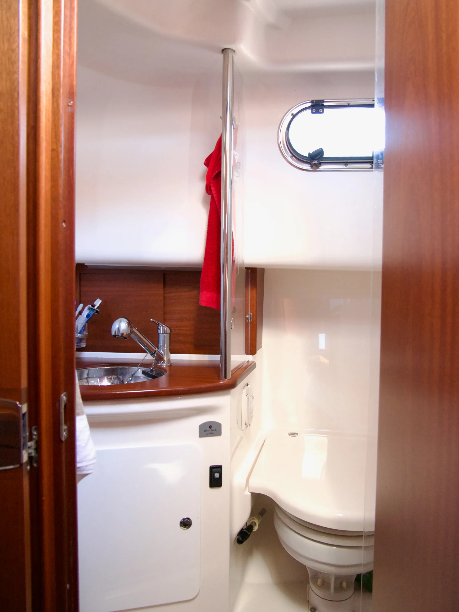 Nere i kabinen finns det en stor bädd i hytten på babord sida, samt ytterligare en bädd i hytten mot fören. Totalt finns det fyra sovplatser ombord. Nere i kabinen finner du även en stor wc med tvättställ, dusch och toalett.