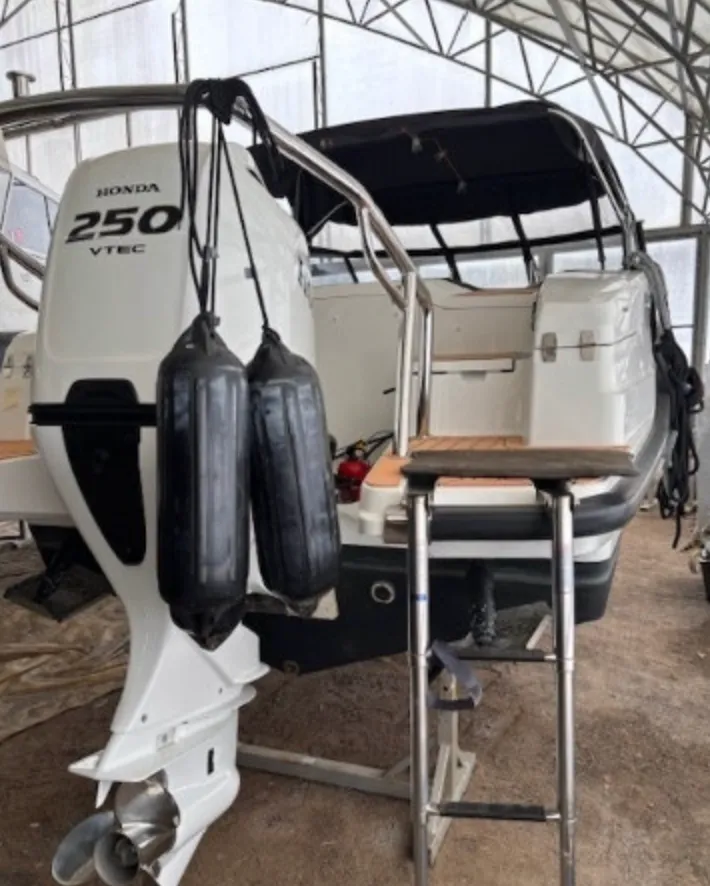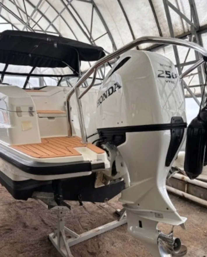 Båten är försedd med en Honda 250 HK VTEC i en matchande vit kulör och med elektroniskt reglage. Motorn har endast 28 gångtimmar på mätaren och är ett perfekt val för för båten. Med detta motoralternativ når du toppfarter över 40 knop och får en bra bränsleekonomi i marschfart.