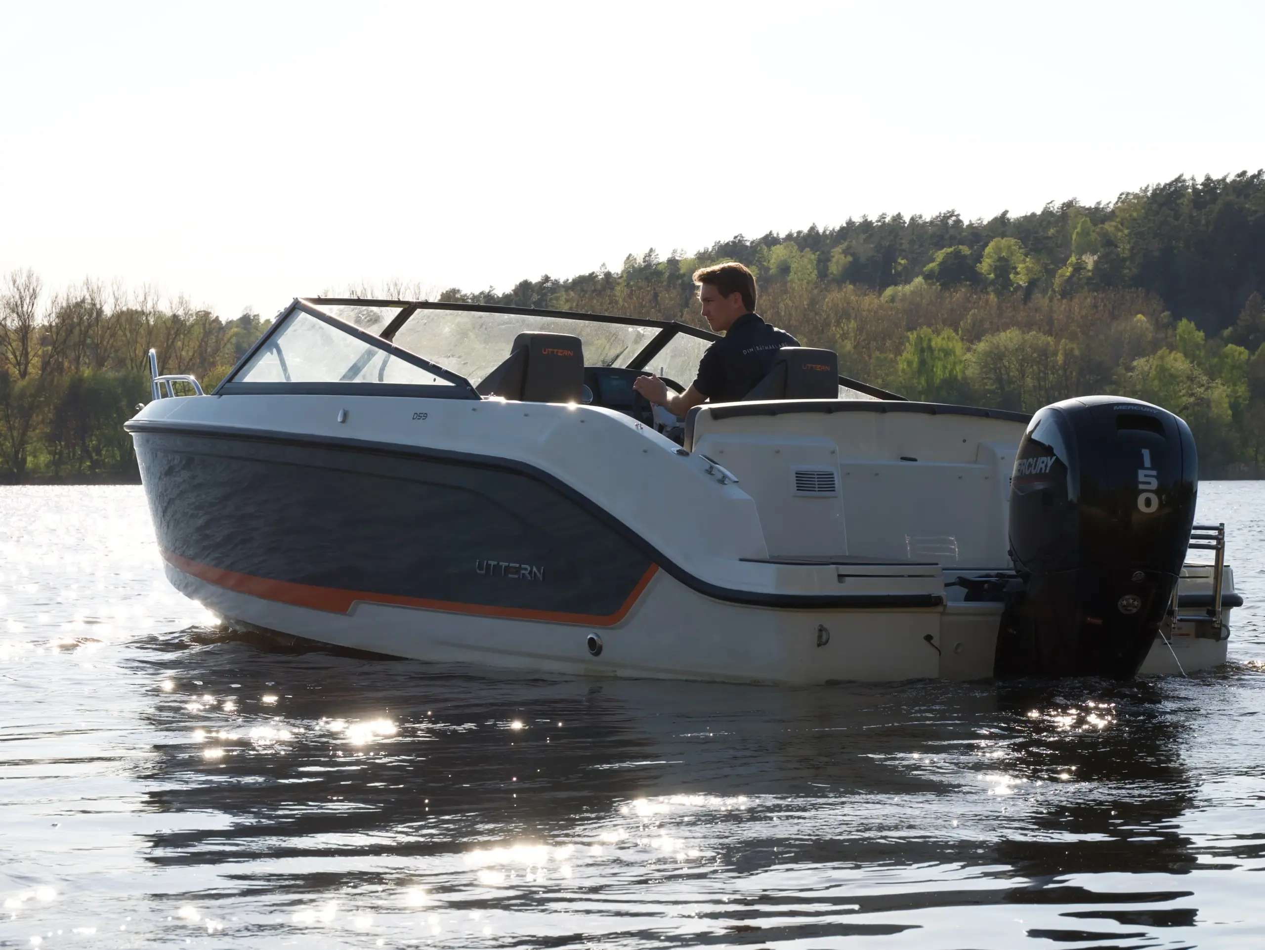Uttern D59 är en daycruiser som sätter prestanda och komfort i fokus, för båtförare såväl som för passagerare. Med modernt designspråk och välplanerade detaljer är denna båt en utmärkt daycruiser. Tack vare att passagen ned till sittbrunnen är positionerad längst till vänster, skapas extra bra sikt och rymd åt föraren. Sittbrunnen rymmer komfortabelt 6 passagerare. Förarplatsen är väl genomtänkt med instrument för motordata, plotter. Ruffen rymmer bekvämt två vuxna personer för övernattning.