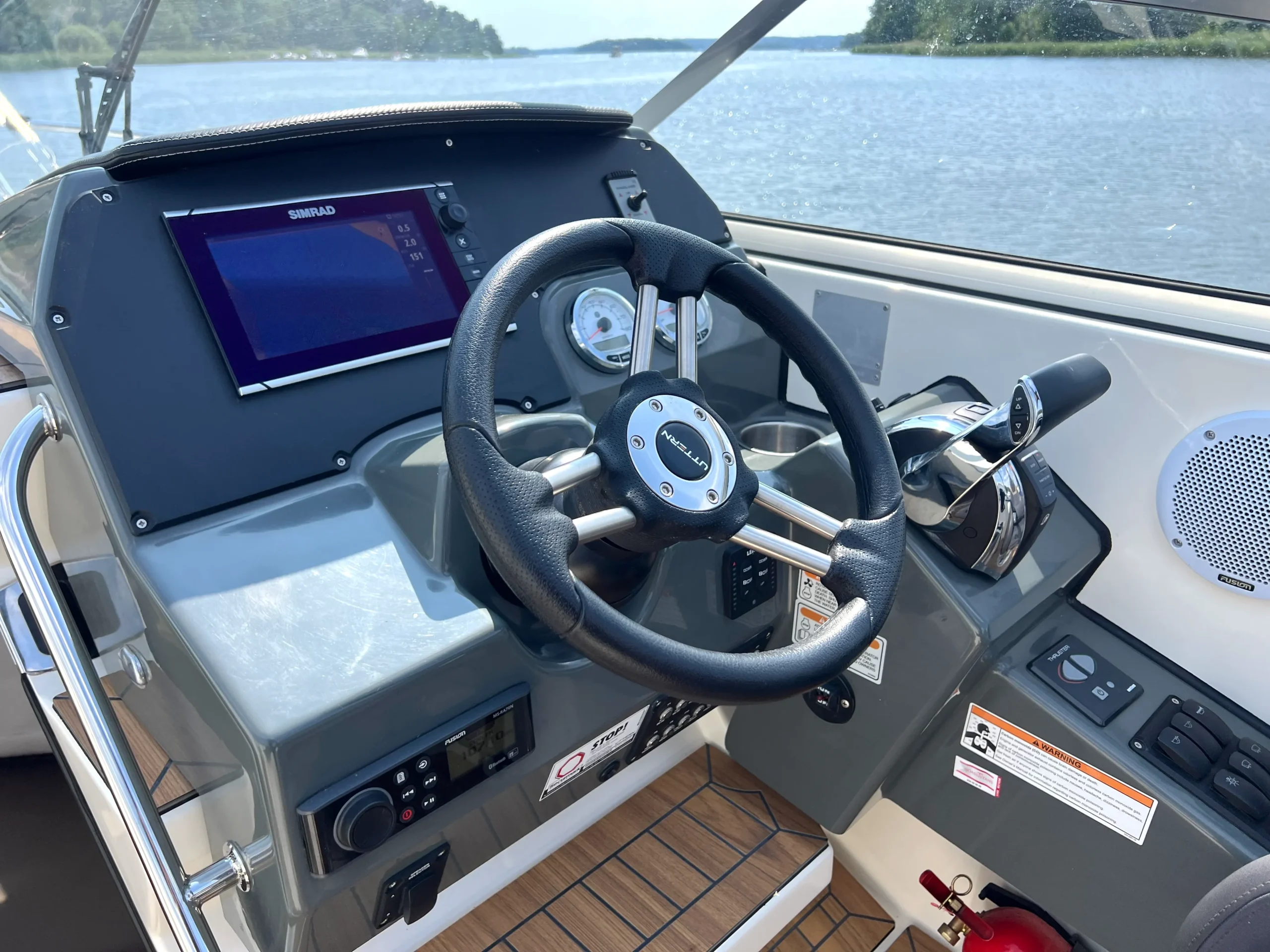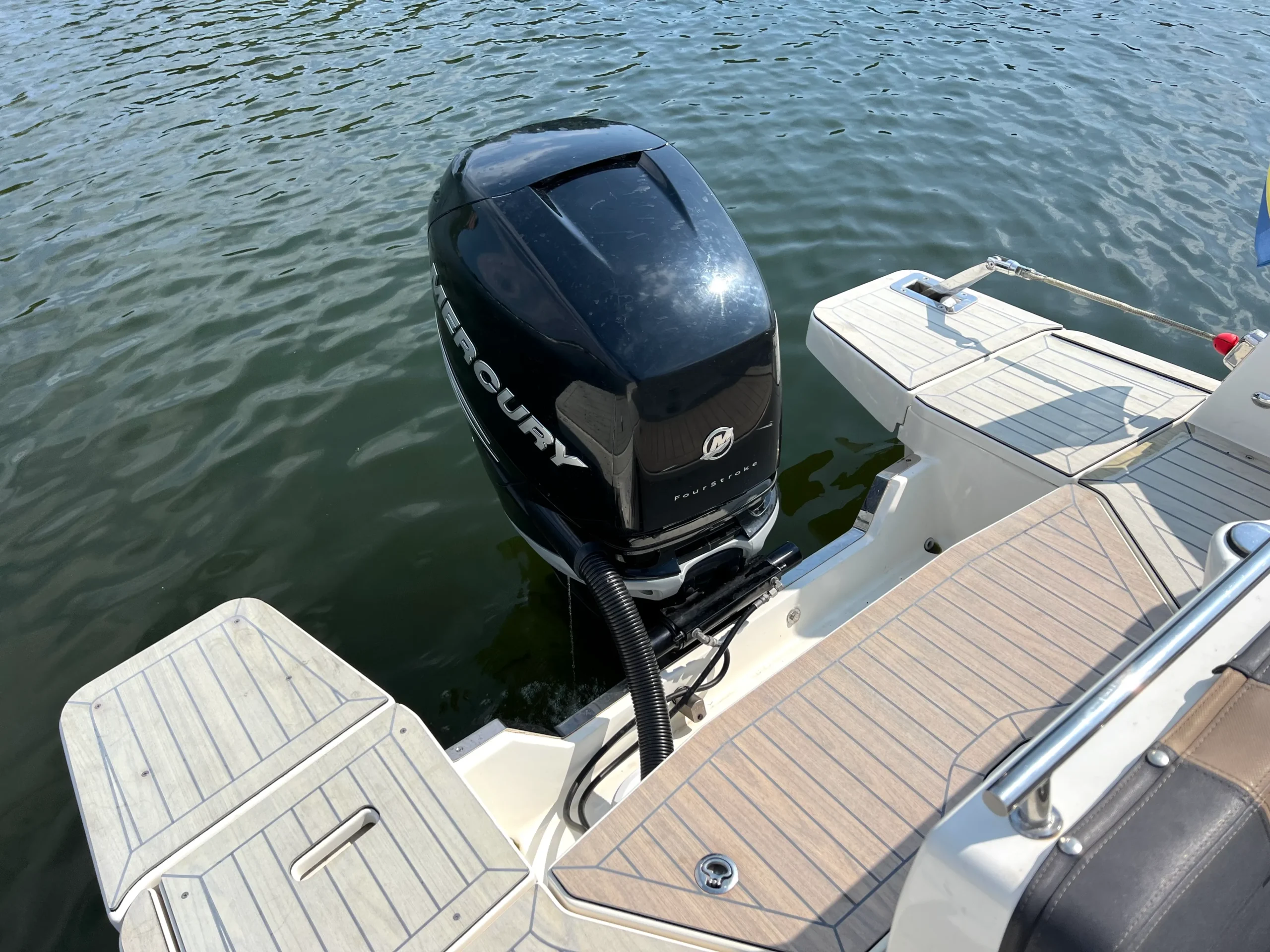 På akterspegeln sitter det en Mercury Verado 250 hk som är regelbundet servad varje år och har gått 280 timmar. Den ger båten utmärkta köregenskaper och snabb acceleration upp i plan.
