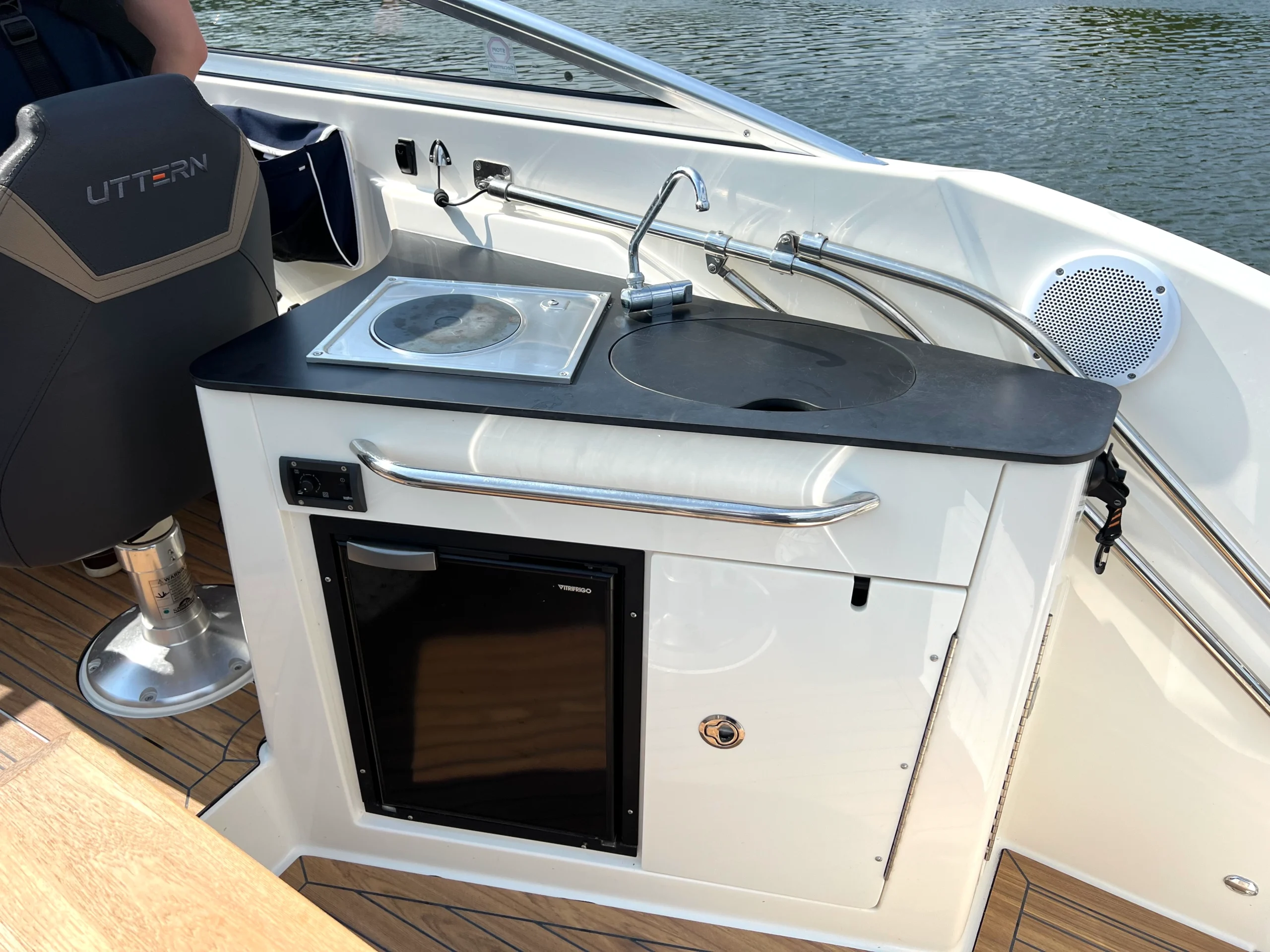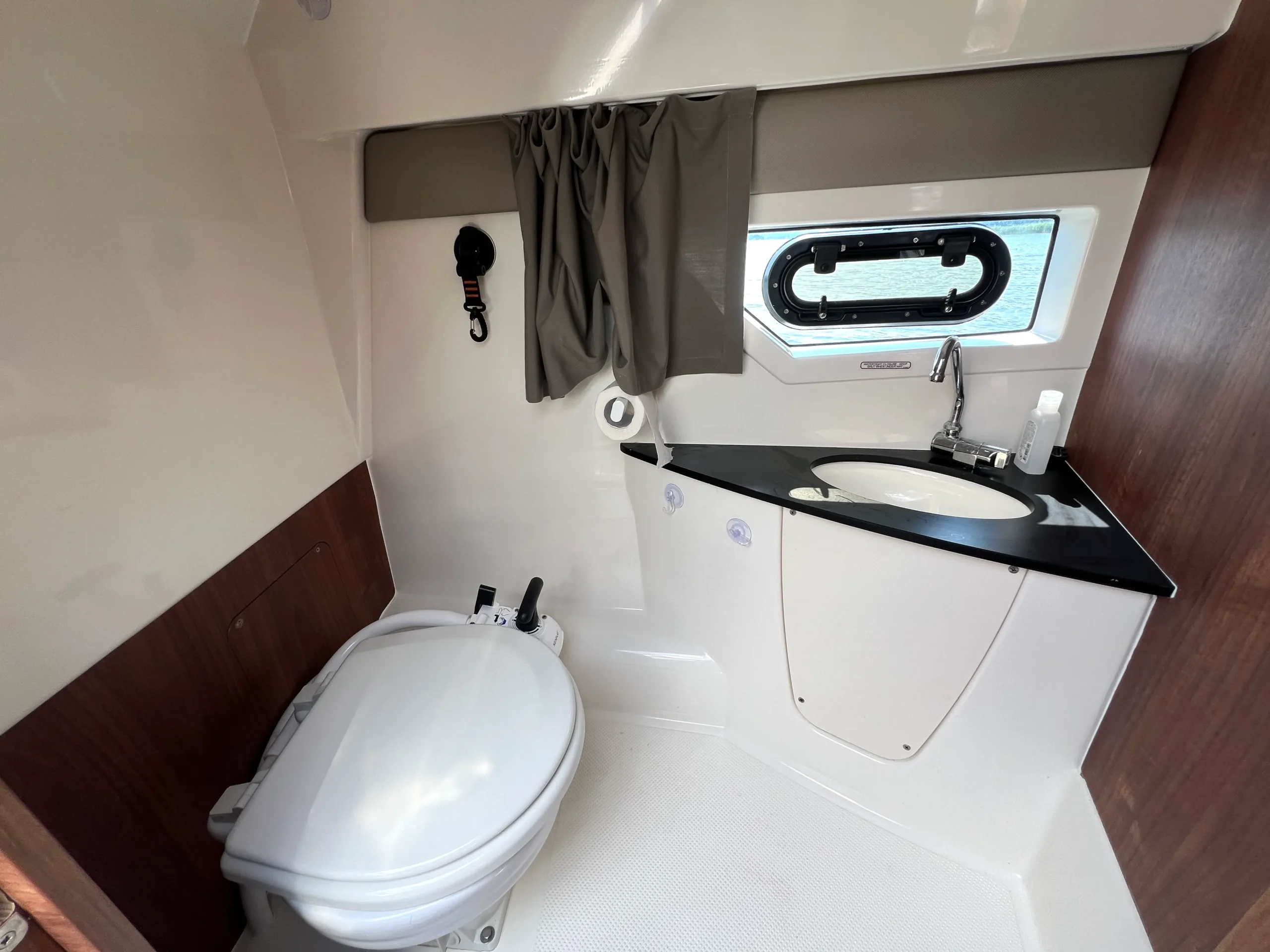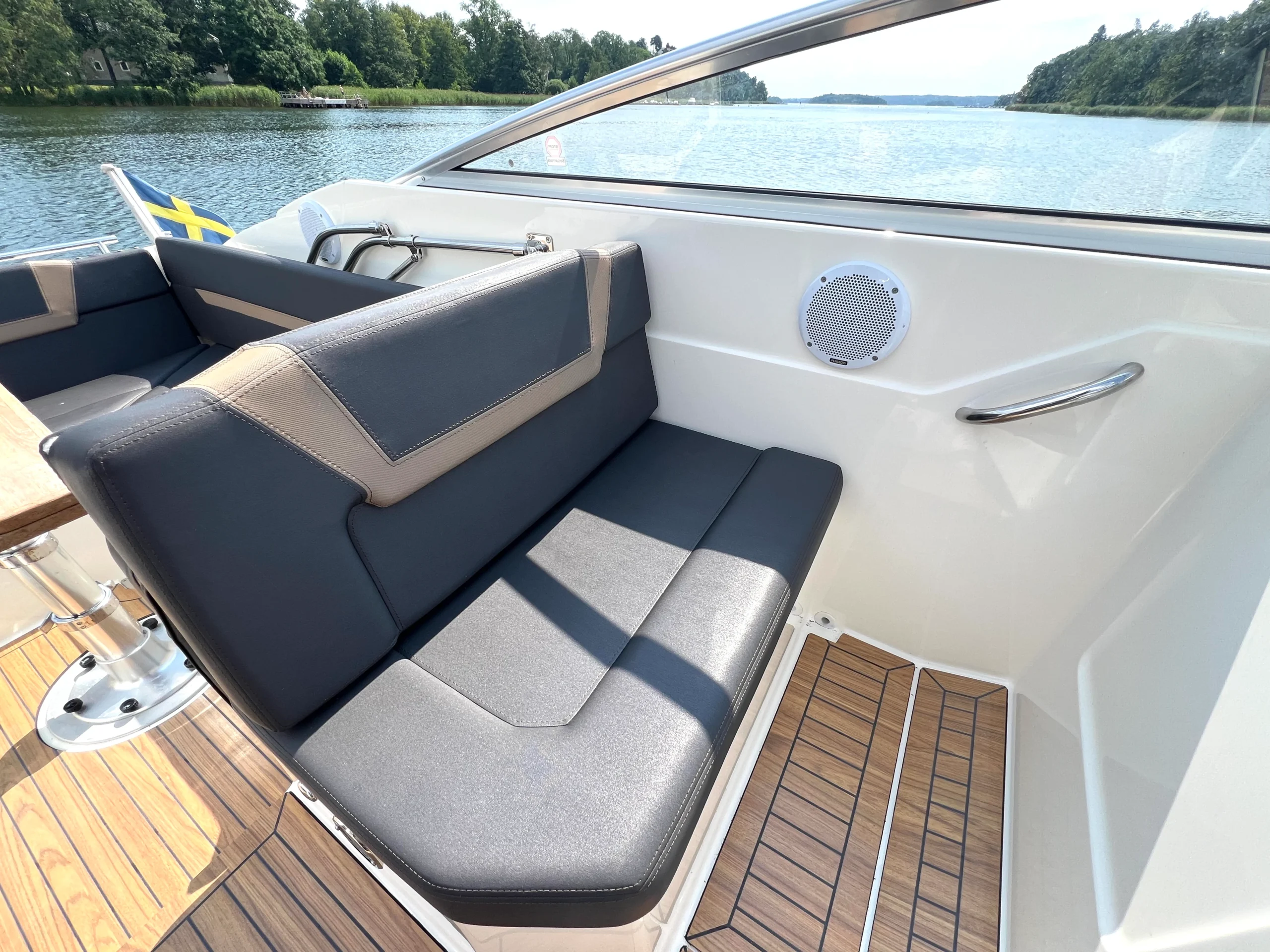 Här kombineras elegant design med smarta lösningar för ett bekvämt liv ombord. I den rymliga sittbrunnen finns en generös soffgrupp som enkelt kan omvandlas till en solbädd – perfekt för lata dagar till sjöss. Intill finns ett välutrustat pentry med spis, kyl och diskho som gör matlagningen smidig även på vattnet.