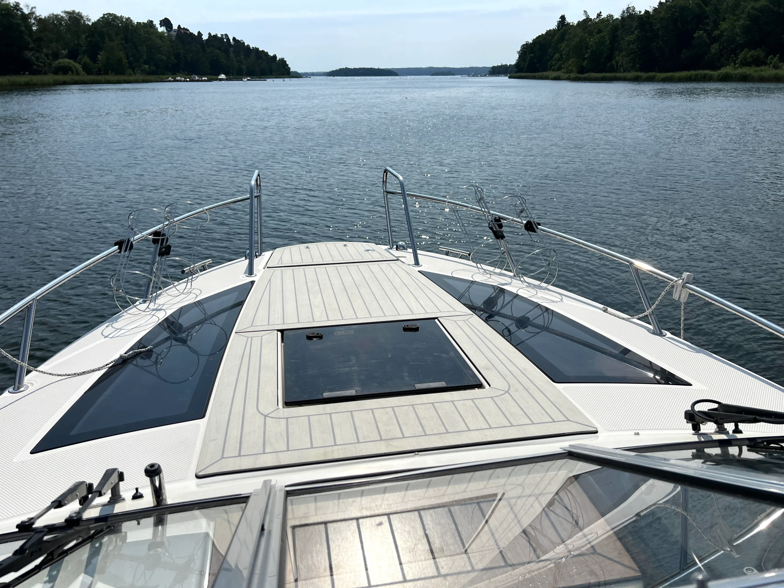 Under däck väntar en ljus och luftig kabin med fyra sovplatser – en större dubbelkoj och en stickkoj. Tack vare stora fönster och bra takhöjd känns det både inbjudande och öppet. Här finns även ett separat toalettutrymme med handfat.
