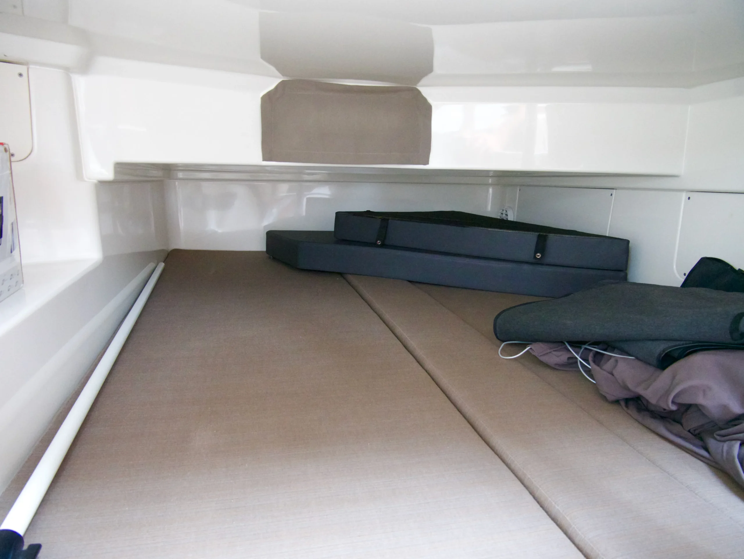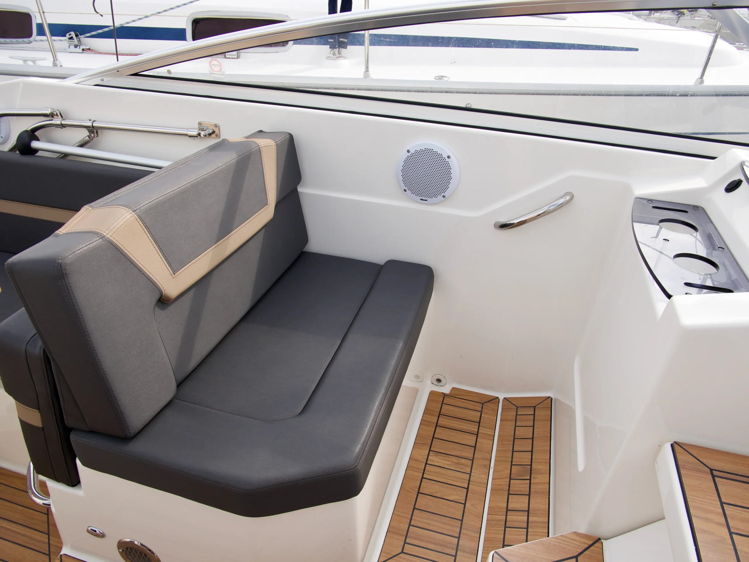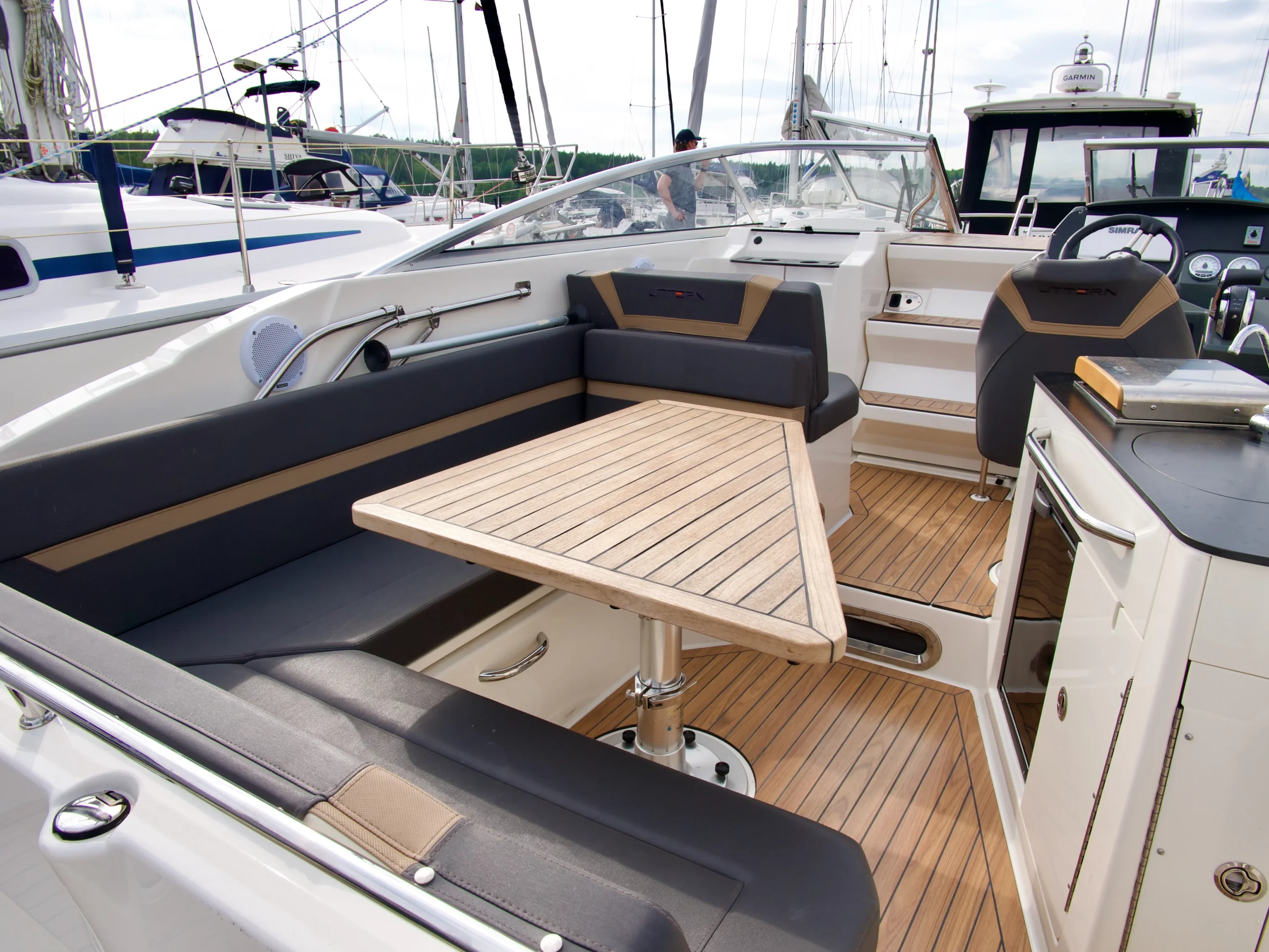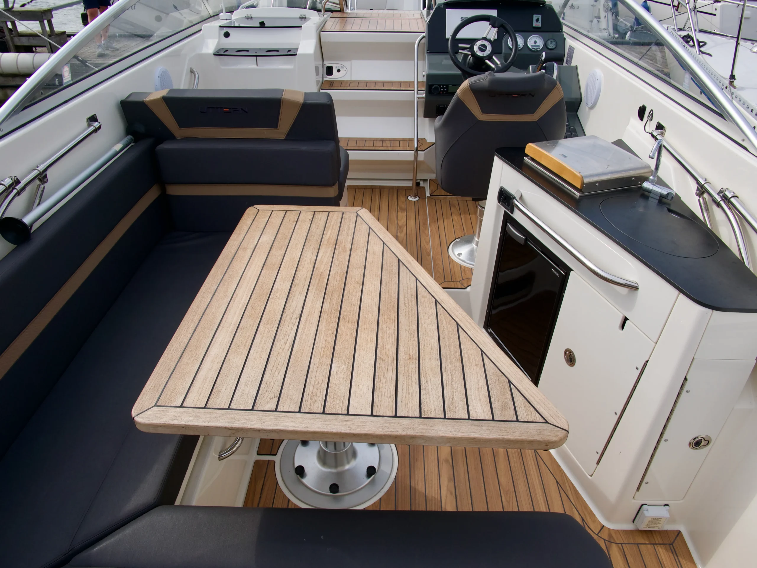Här kombineras elegant design med smarta lösningar för ett bekvämt liv ombord. I den rymliga sittbrunnen finns en generös soffgrupp som enkelt kan omvandlas till en solbädd – perfekt för lata dagar till sjöss. Intill finns ett välutrustat pentry med spis, kyl och diskho som gör matlagningen smidig även på vattnet.