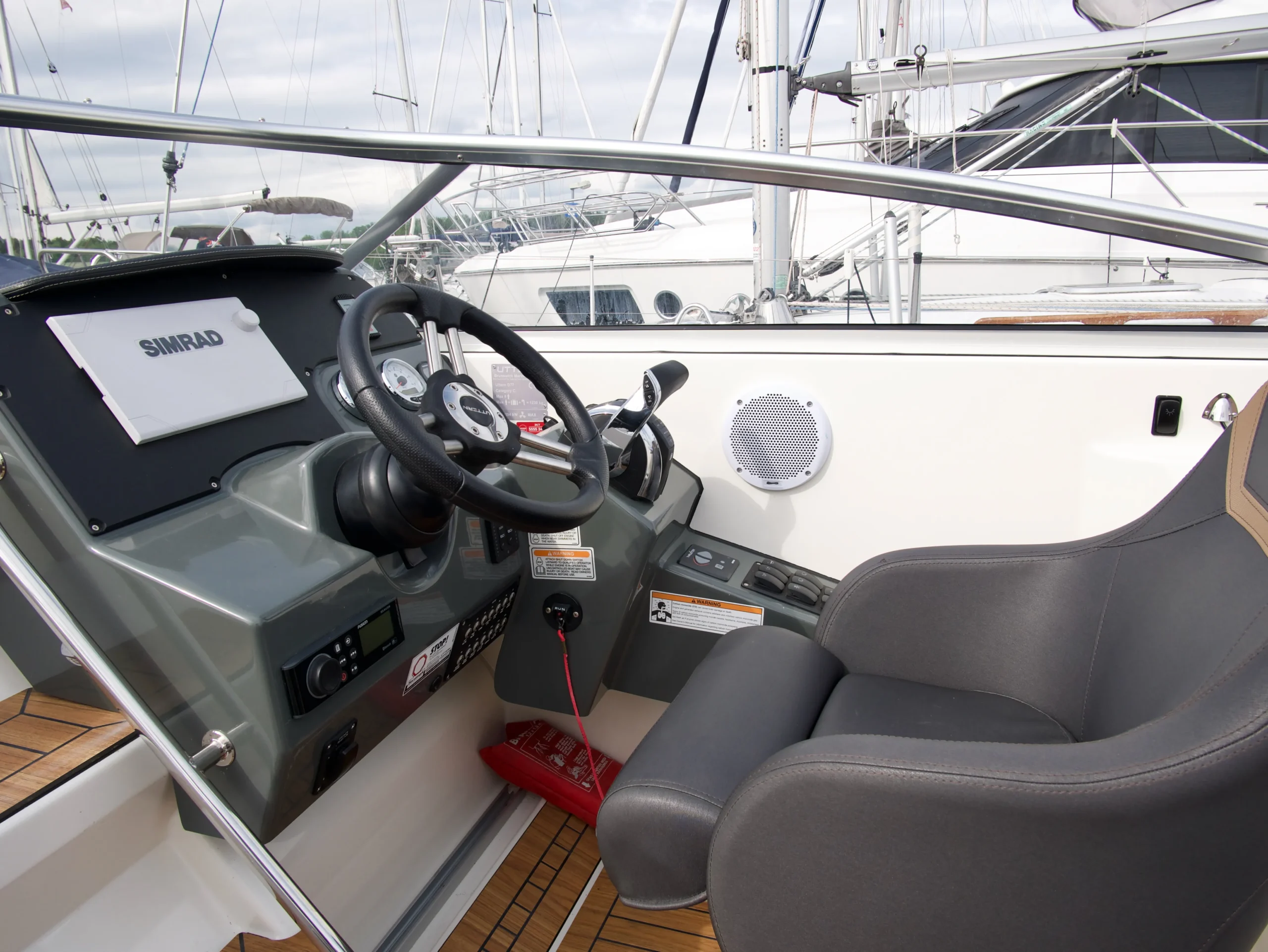 Förarplatsen är modern och överskådlig, utrustad med instrument från Mercury och Simrad. Här har kaptenen full kontroll tack vare hjälpmedel som bogpropeller, trimplan och elektriskt ankarspel.