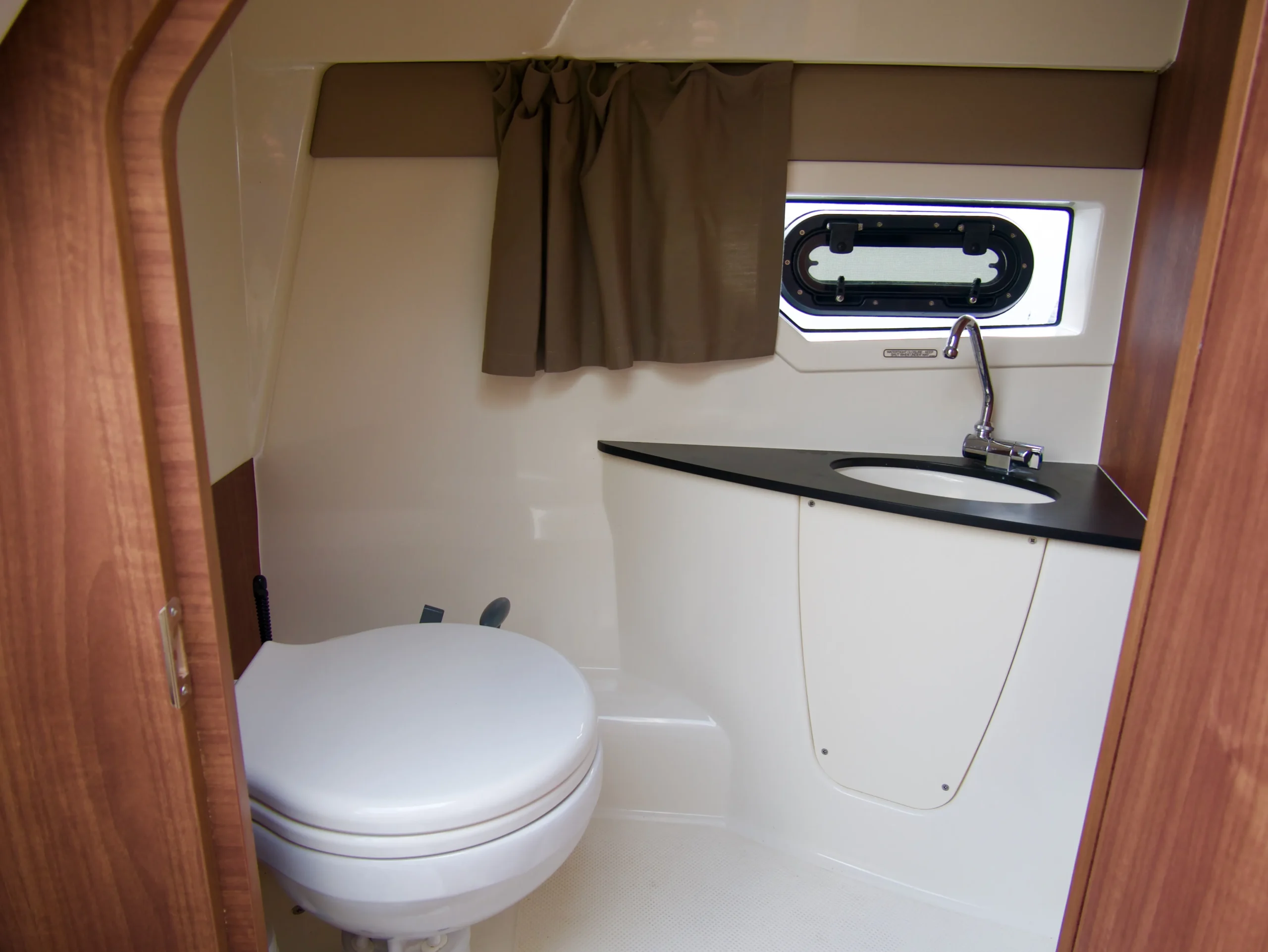 Under däck väntar en ljus och luftig kabin med fyra sovplatser – en större dubbelkoj och en stickkoj. Tack vare stora fönster och bra takhöjd känns det både inbjudande och öppet. Här finns även ett separat toalettutrymme med handfat.