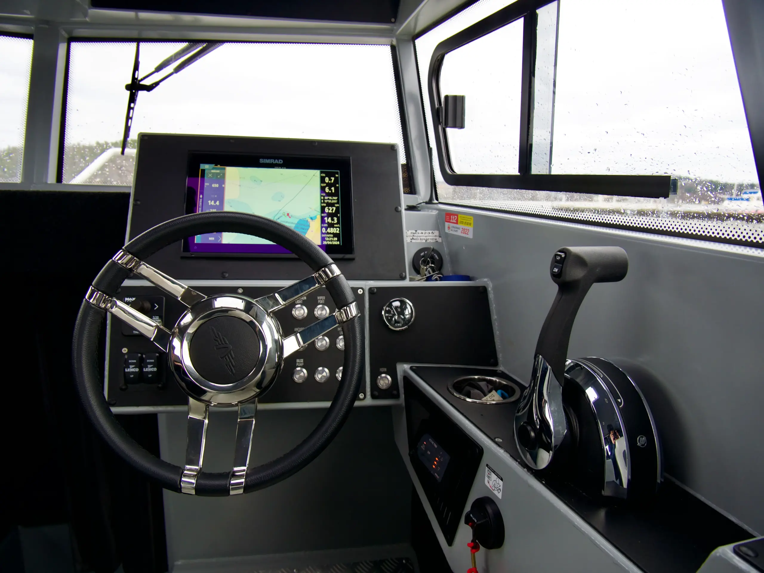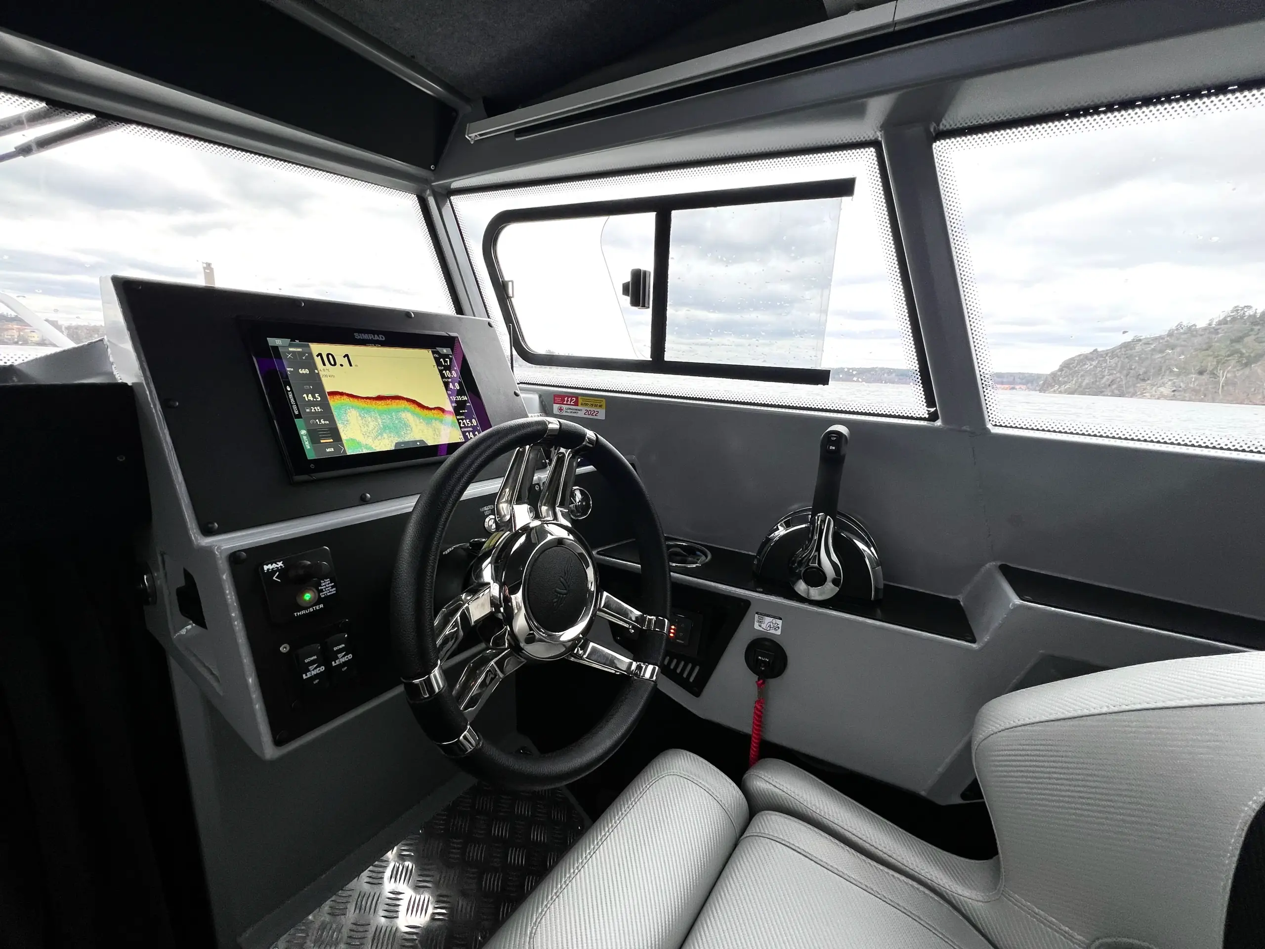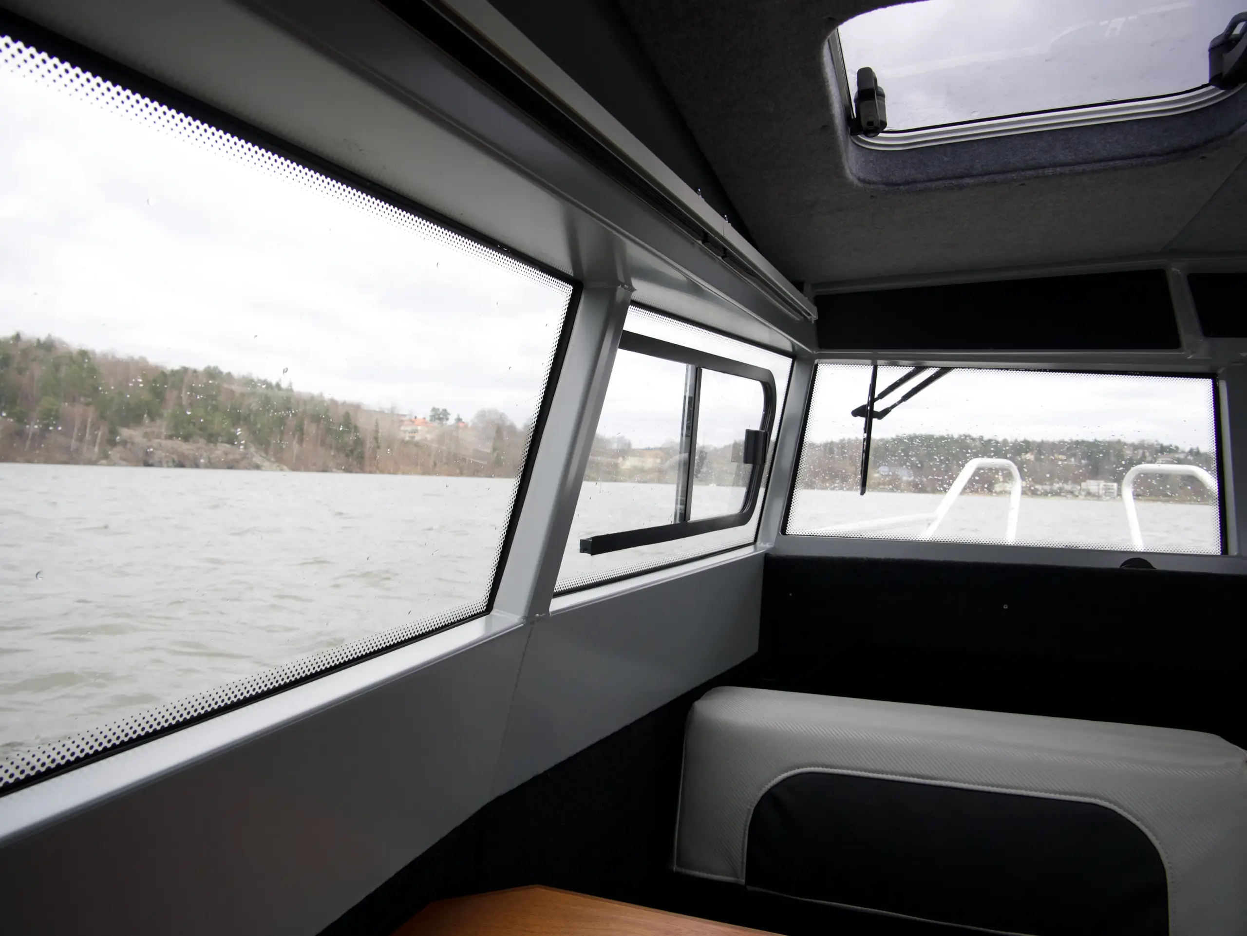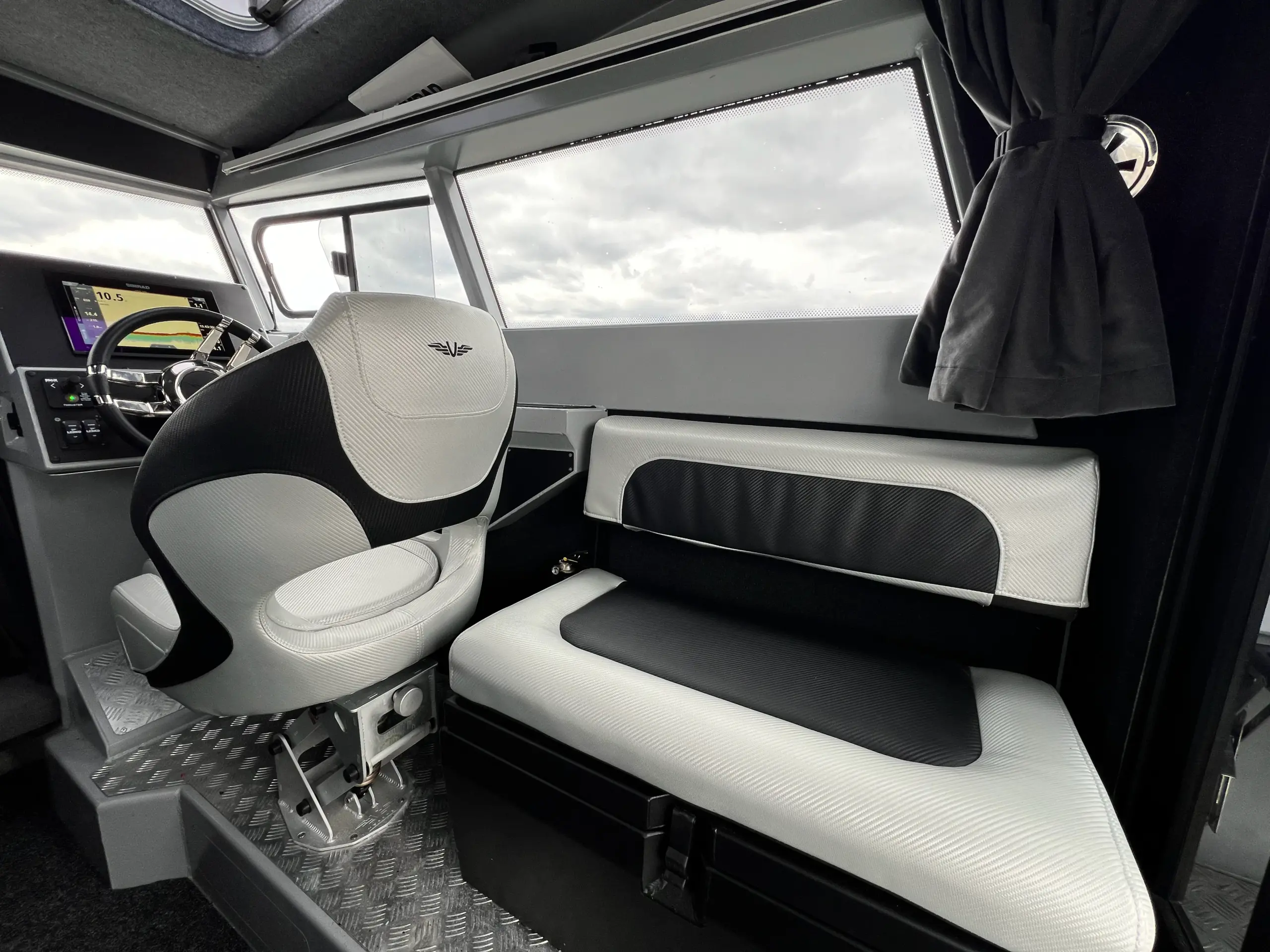 Båten har en rymlig kabin med genomtänkt design och en trevlig atmosfär. Här finns det en soffgrupp med bord där fyra passagerare kan sitta bekvämt och njuta av färden. Kaptenen sitter bekvämt på förarplatsen som är utrustad med offshore-stativ. Bogpropeller, plotter från Simrad och trimplan sitter lättillgängligt på instrumentpanelen vilket förenklar hanteringen av båten. I fören finns det sovplatser för två vuxna och på akterdäck finns det ytterligare sittplatser och ett bord.