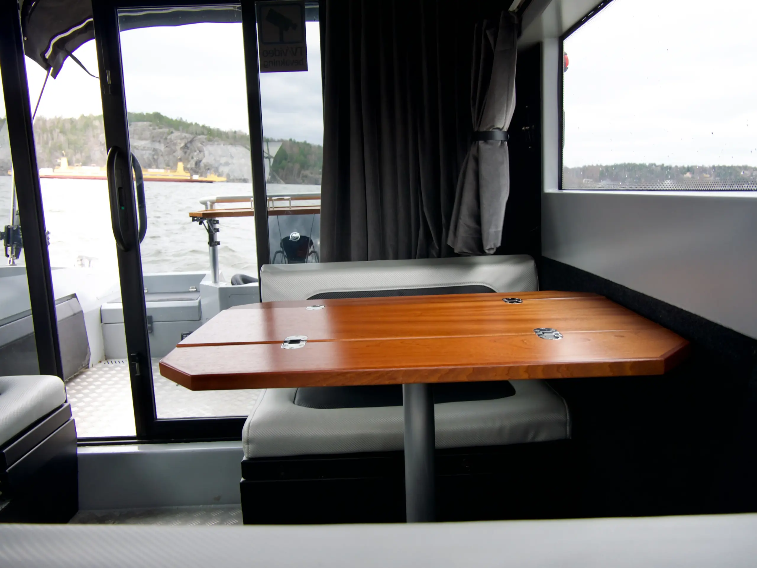 foilerad överbyggnad och tak, landström, matta på akterdäck och i kabin, mörkläggningsgardiner för kabin, glasförstärkta rutor.