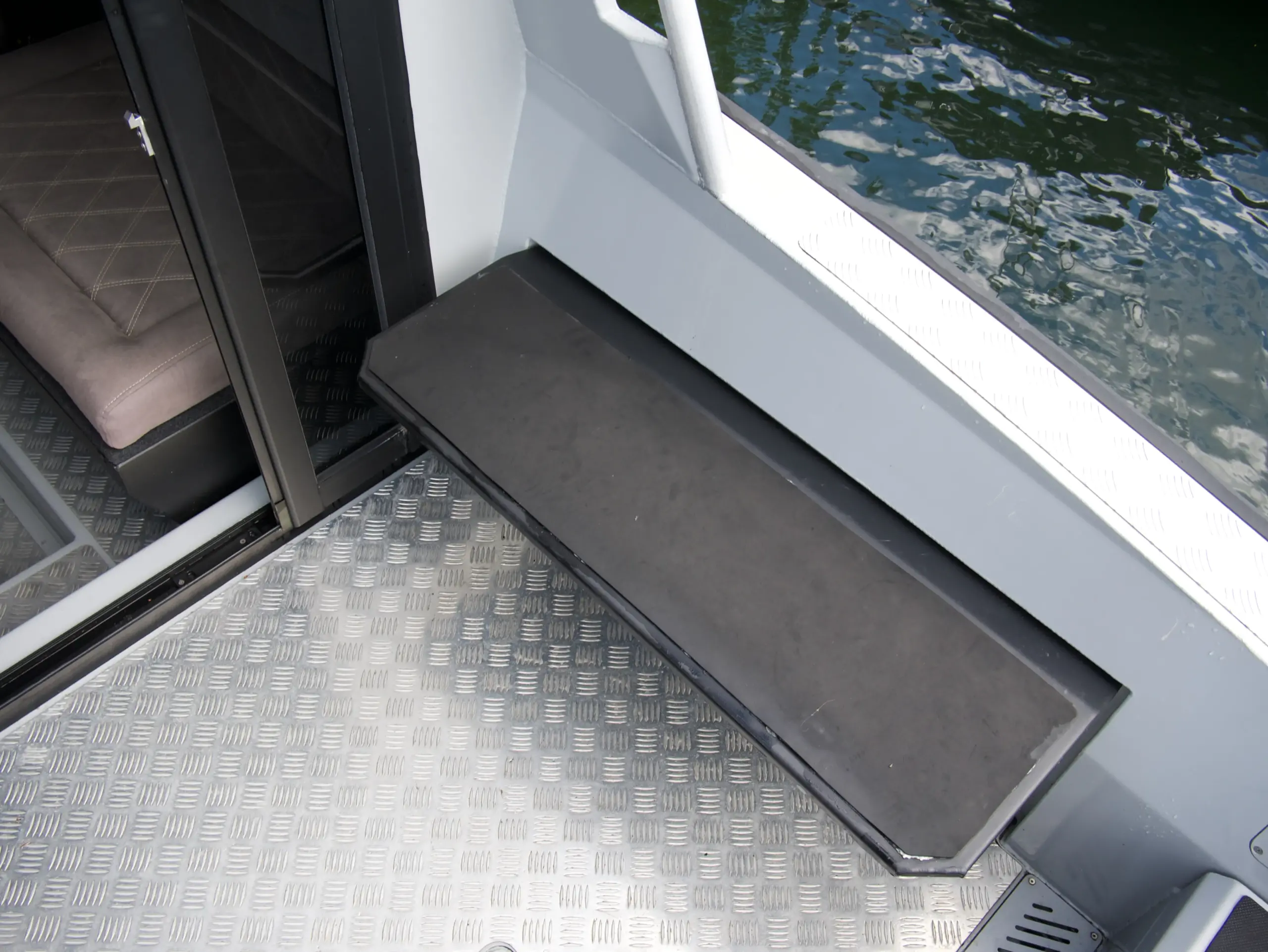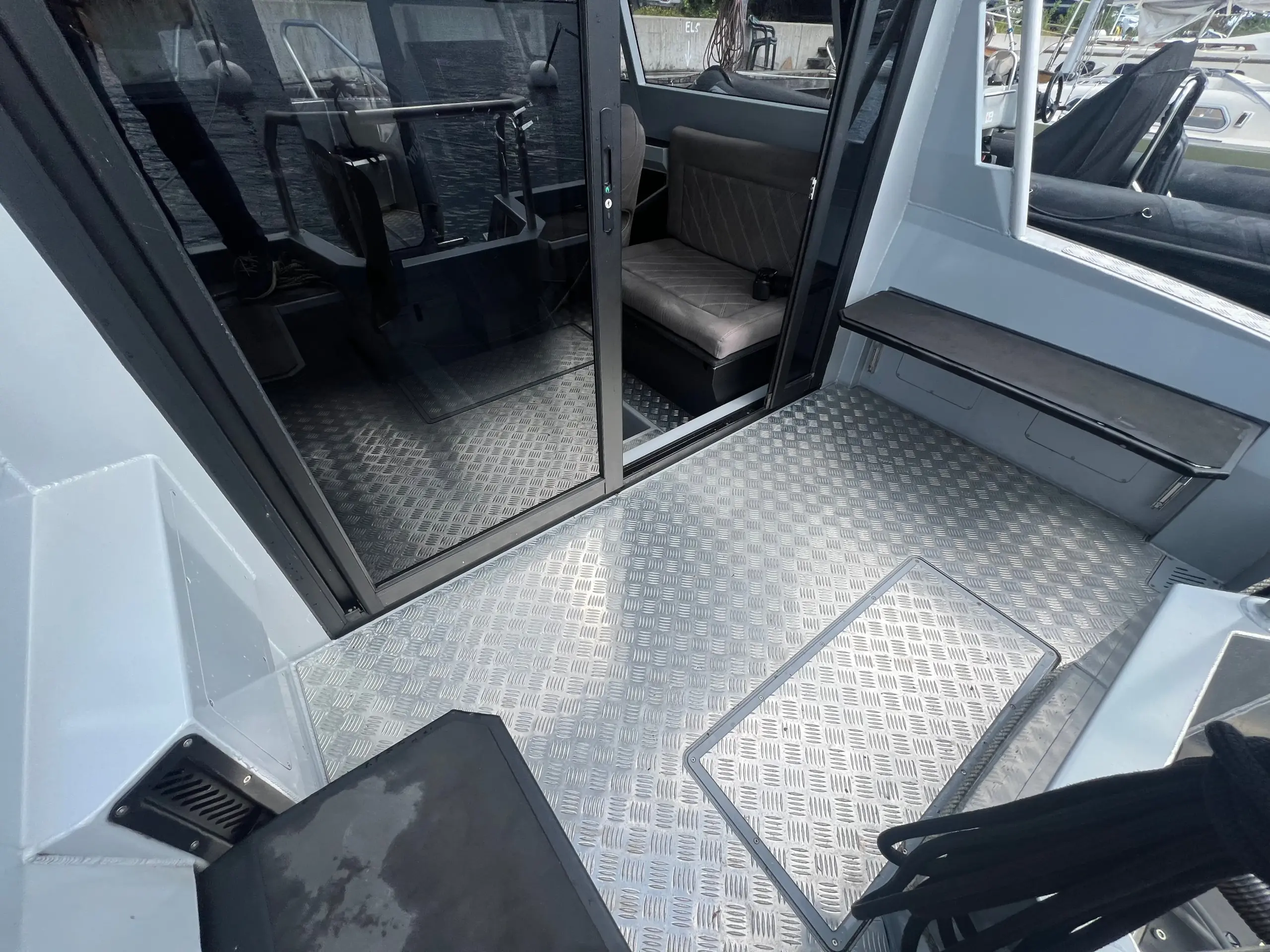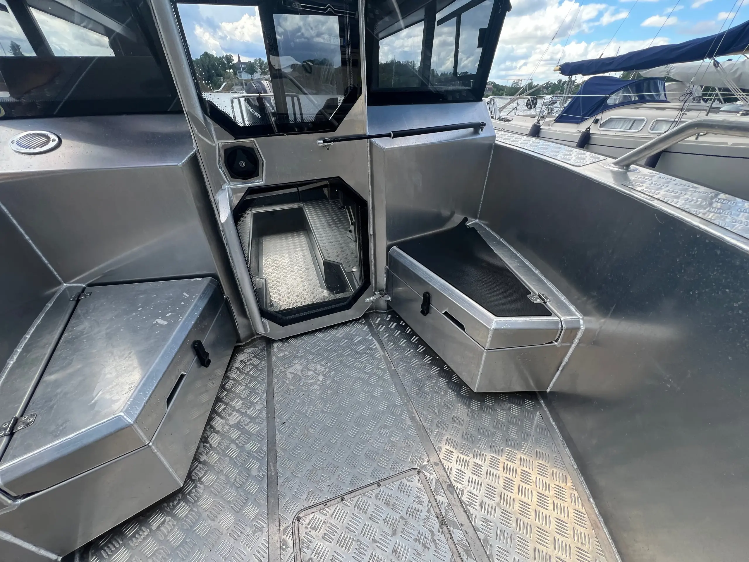 Akterdäcket är utrustat med klaffbänkar och är en perfekt lastyta. Båten är av genomgående hög kvalitet och klarar av hårda förhållanden samtidigt som den kräver minimalt med underhåll tack vare sin konstruktion i aluminium.