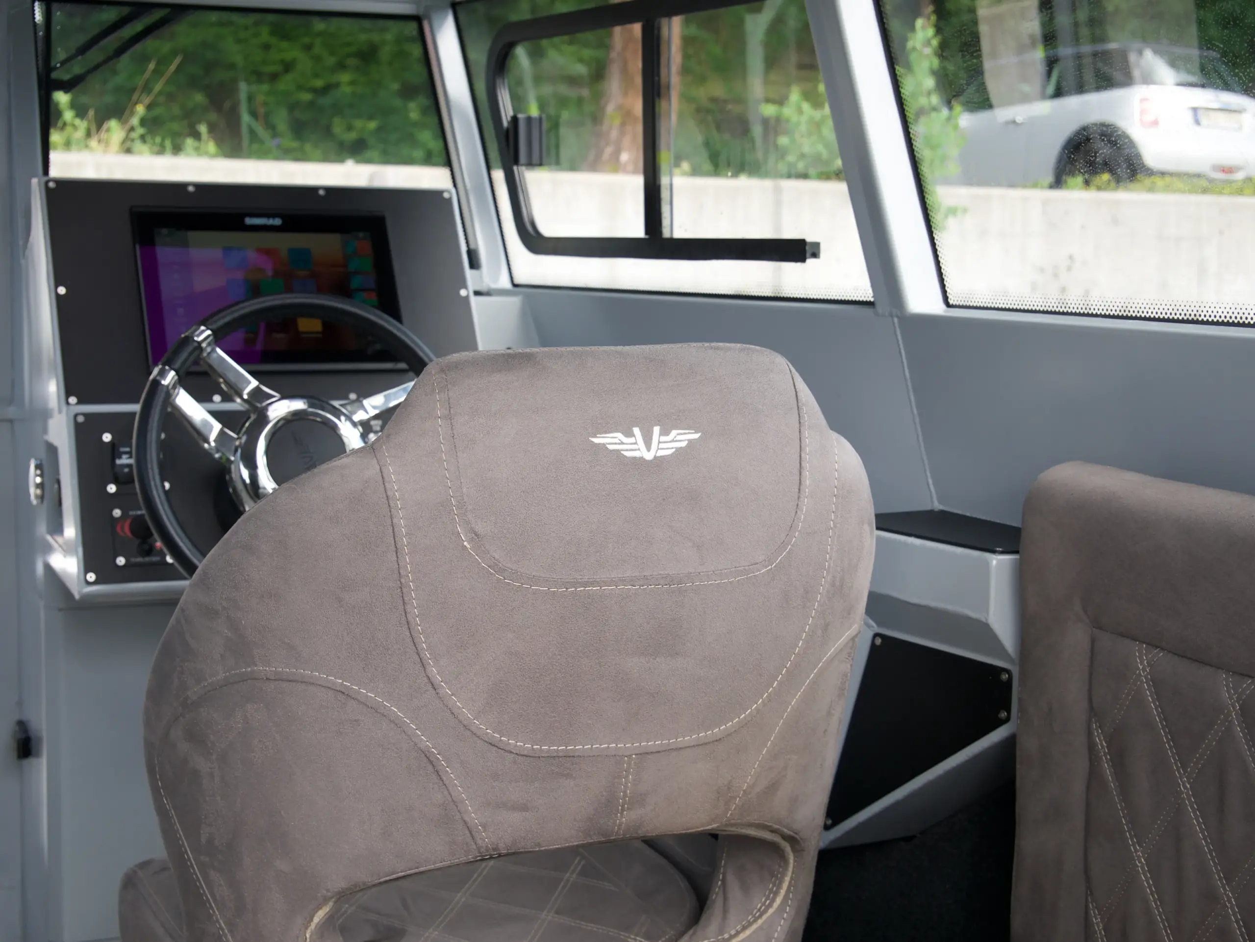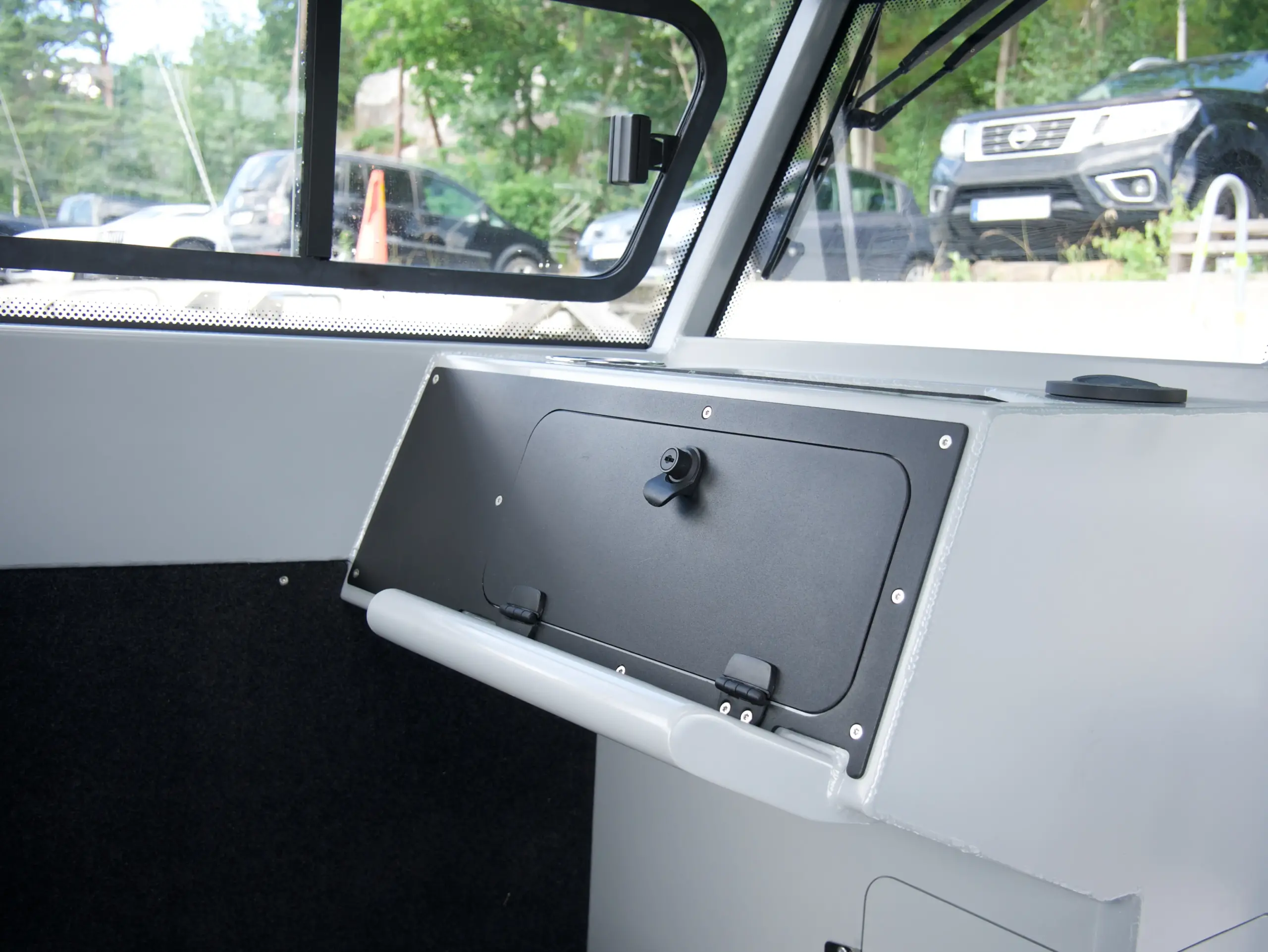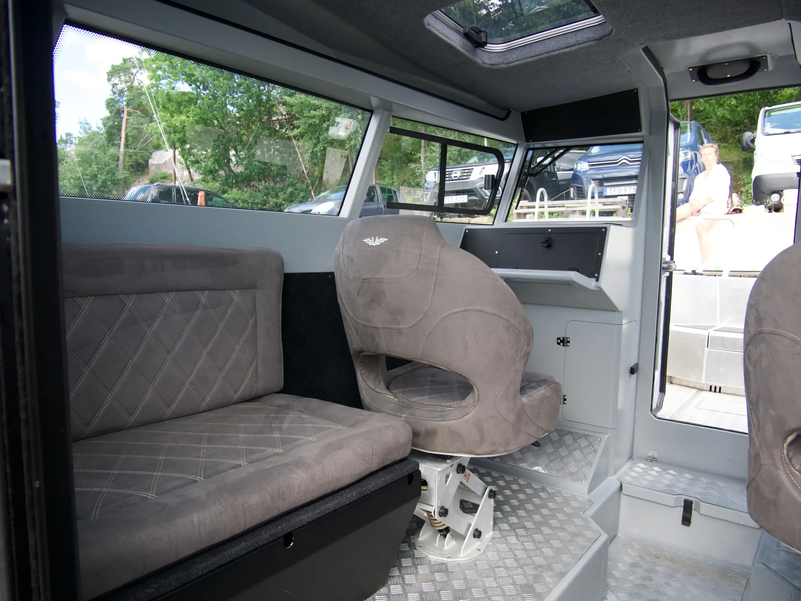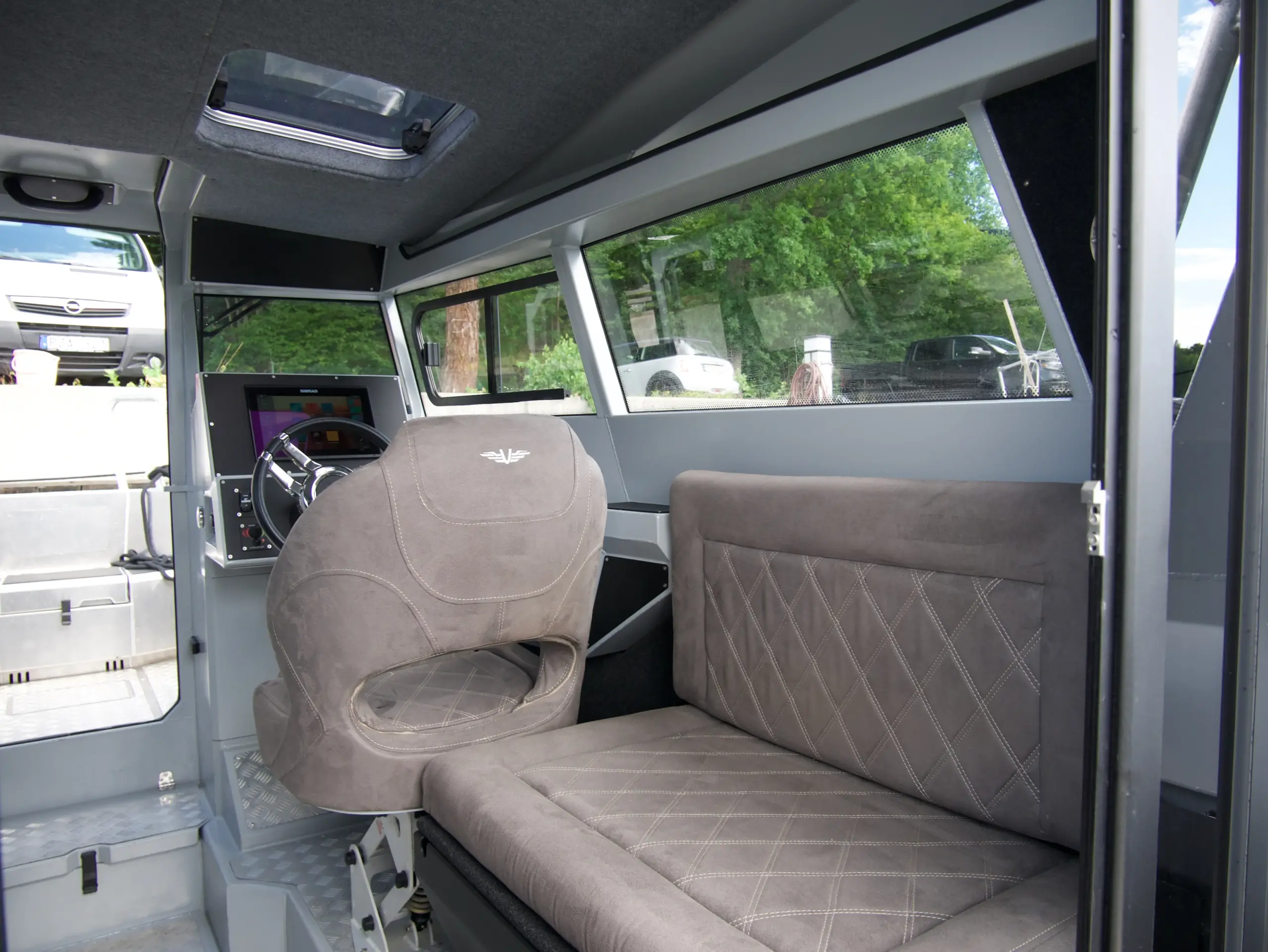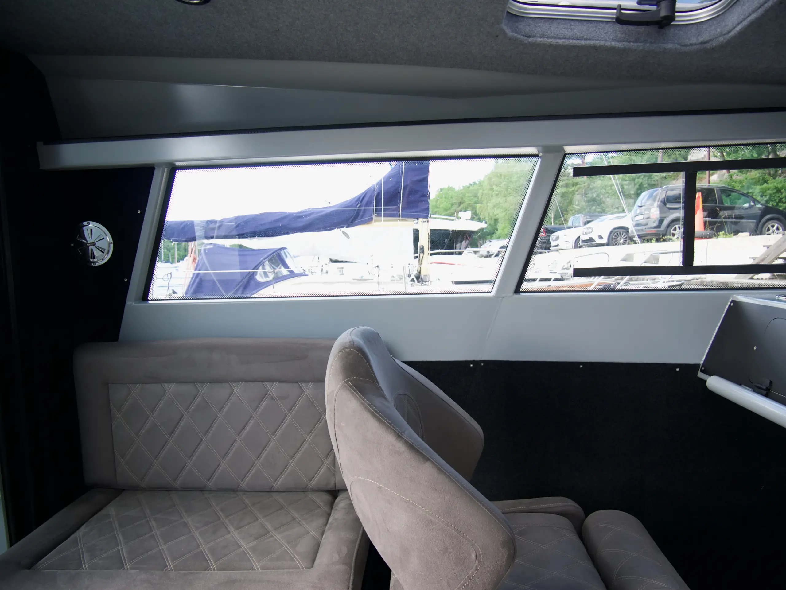 På fördäck finns det två sittplatser för den som vill njuta av vinden under färden. I kabinen sitter ett sällskap på fyra personer bekvämt och föraren har god sikt runtom båten. Blir det kallt under färden finns det en värmare som ger en behaglig temperatur i kabinen. Det finns även sidorutor och takluckor att öppna om du hellre vill svalka dig.