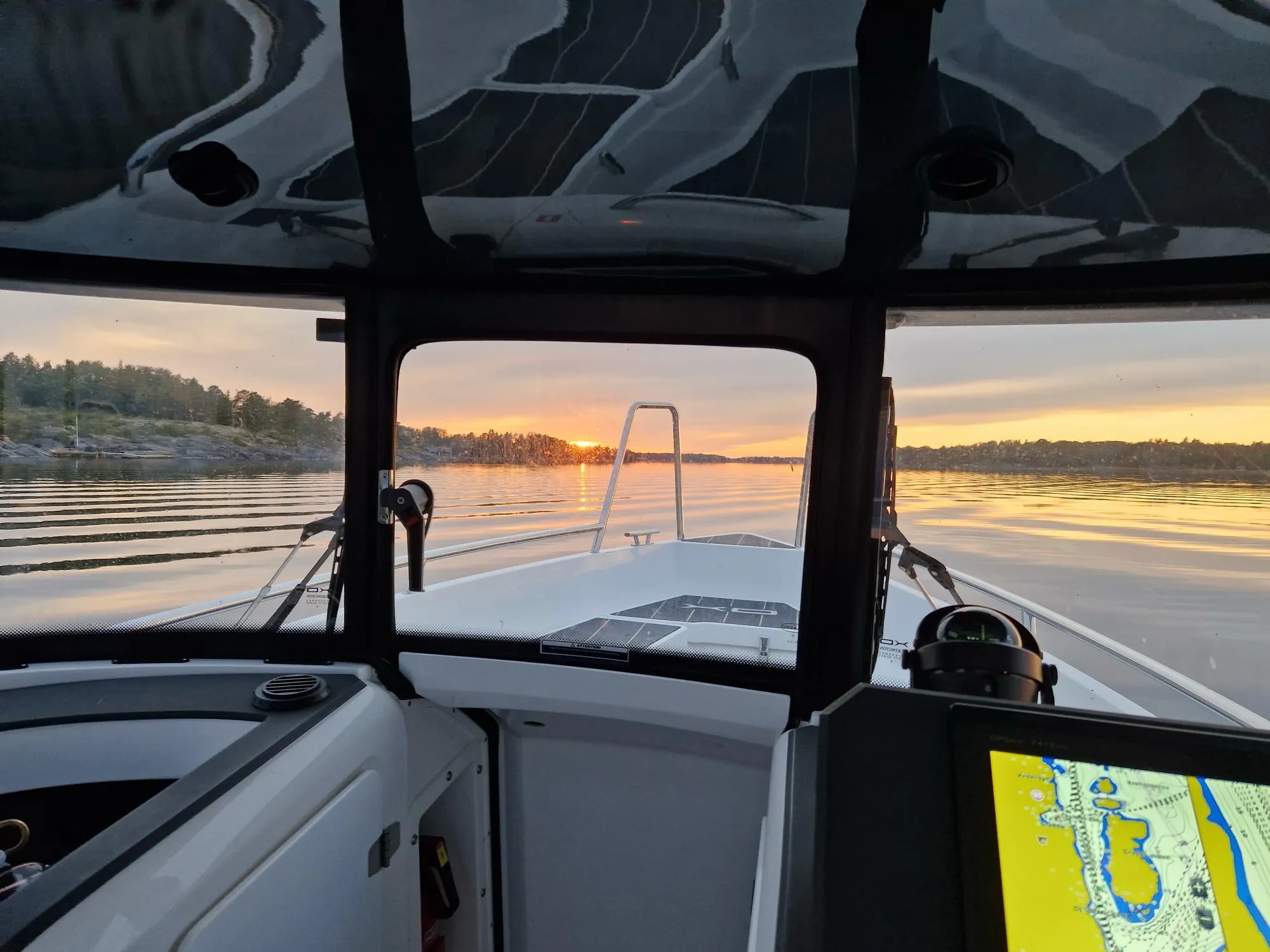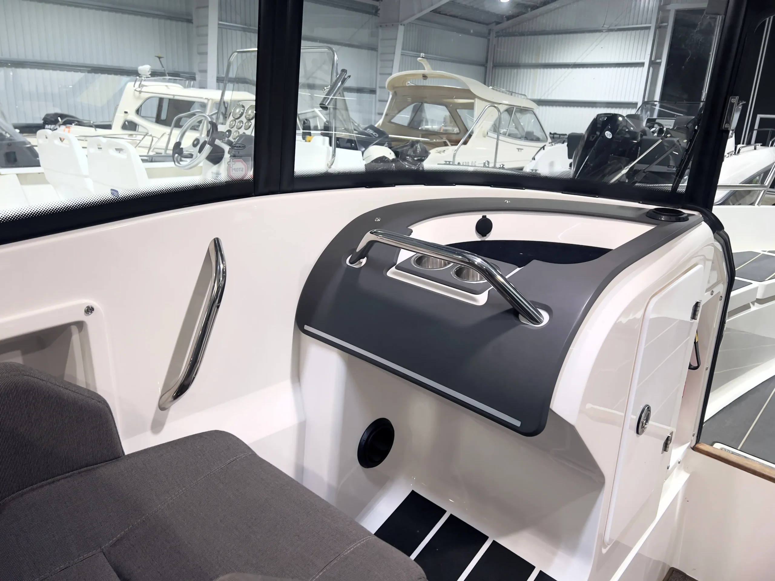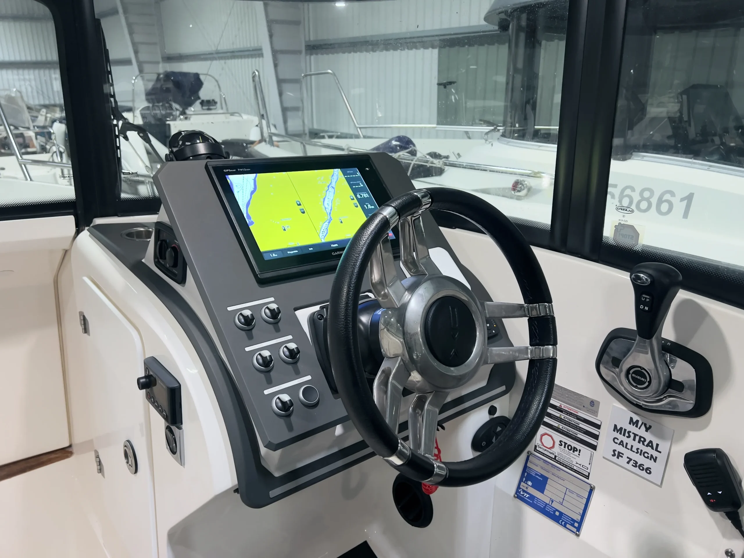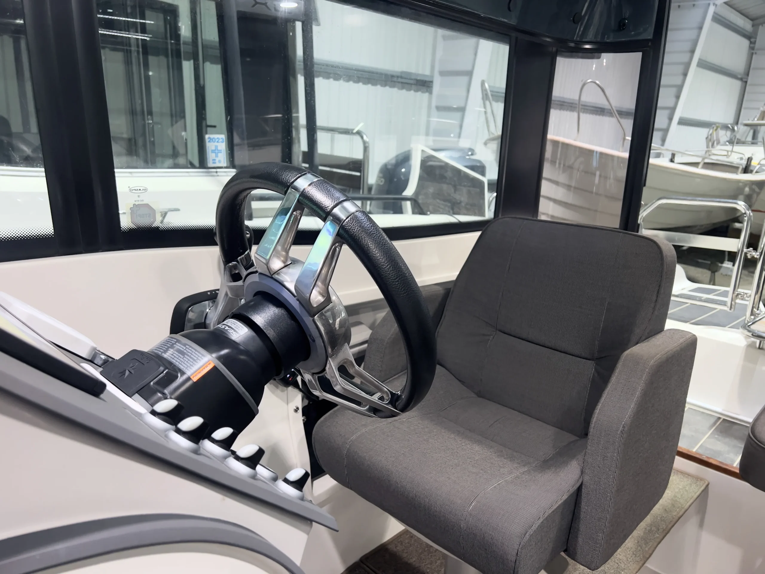 Förarplatsen har en stilren design med ett minimalistiskt utförande som inte kompromissar på funktionalitet. Som förare har du bland annat tillgång till en 12″ plotter, VHF och AIS från Garmin.