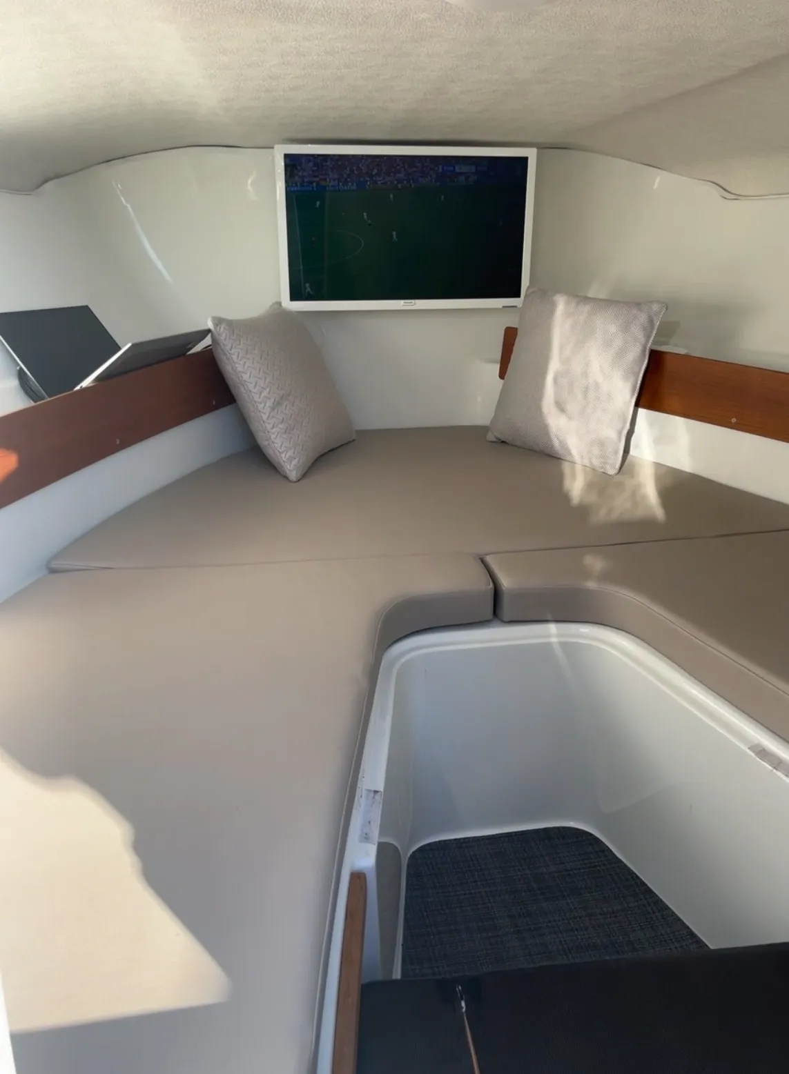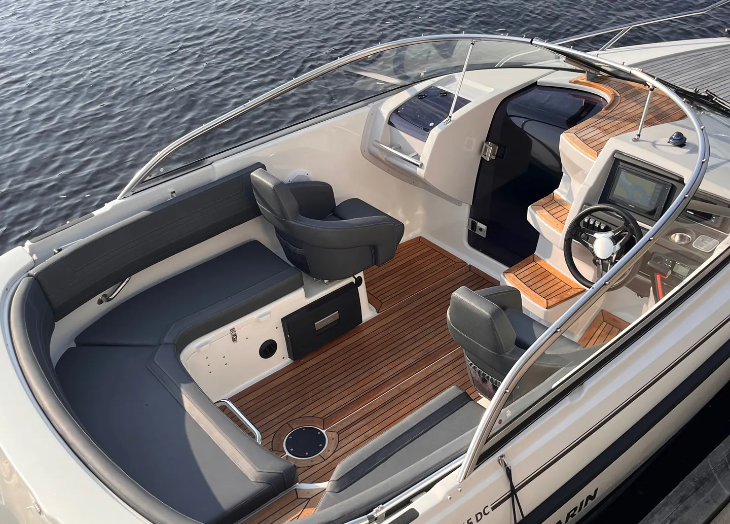 Utrustning: Garmin plotter/GPS, ekolod, Dometic kylskåp 30L, Fusion MS-RA70 ljudsystem, akterkapell, hamnkapell, dubbelt batterisystem, trimplan med automatisering (Mente Marin), värmare Webasto, landström med inverter, vindrutetorkare, solbädd, 12v eluttag, bord i sittbrunn, hydraulstyrning, komplett dynsats, teakdäck, interiörbelysning, vit bottenfärg.